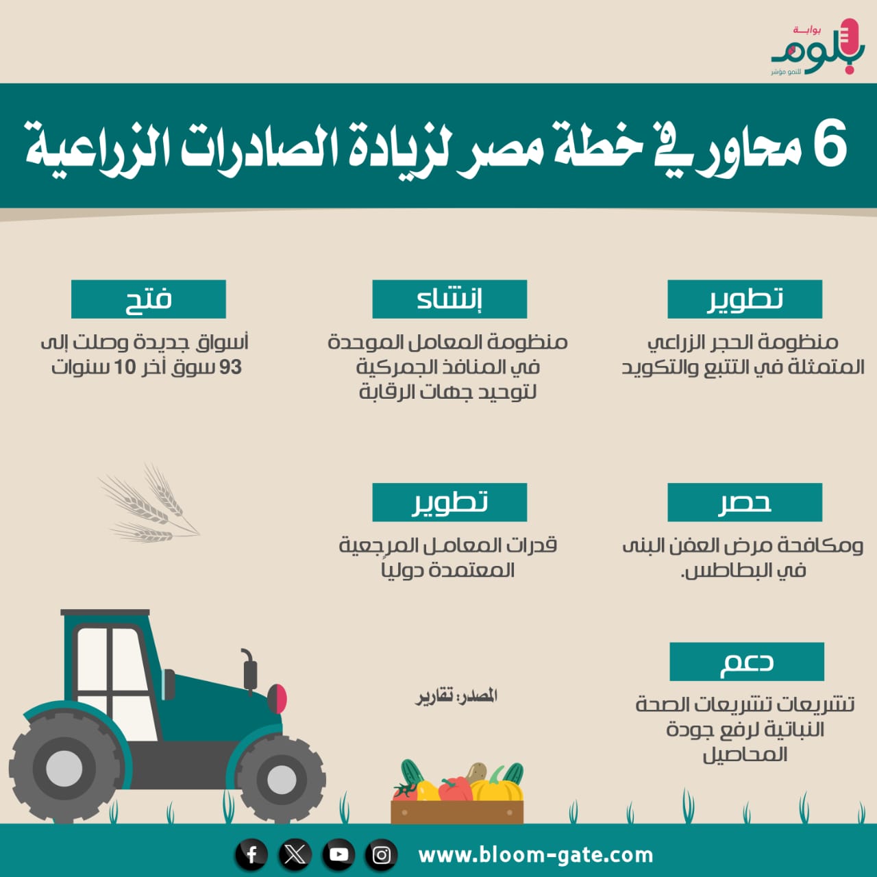 تسلك وزارة الزراعة عدة محاور لتنمية صادرات الحاصلات الزراعية باعتبارها واحدة من الأعمدة الرئيسية للصادرات المصرية، ما يطرح أمامها تحدي فتح أسواق جديدة وإضافة أنواع جديدة من المحاصيل والحفاظ على المعايير المعتمدة في الأسواق الدولية، ويتناول الإنفوجراف التالي محاور استراتيجية زيادة صادرات الزراعة.