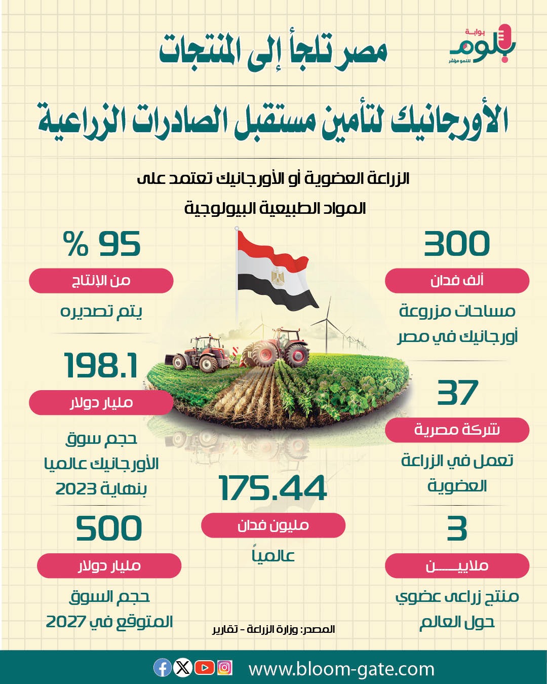 ويشكل التحول للزراعة العضوية أو المعروفة عالمياً بالأورجانيك مصدراً مهماً لتنمية صادرات الحاصلات الزراعية المصرية، نظراً لتنامي الطلب العالمي عليها والتي يعتمد على استخدام المواد الطبيعية البيولوجية في الزراعة بدلا من الأسمدة الكيماوية والمبيدات ومواد المكافحة الضارة بالصحة، وقطعت مصر خطوات جيدة في هذا الصدد سنلقى الضوء عليها في هذا الإنفوجراف.