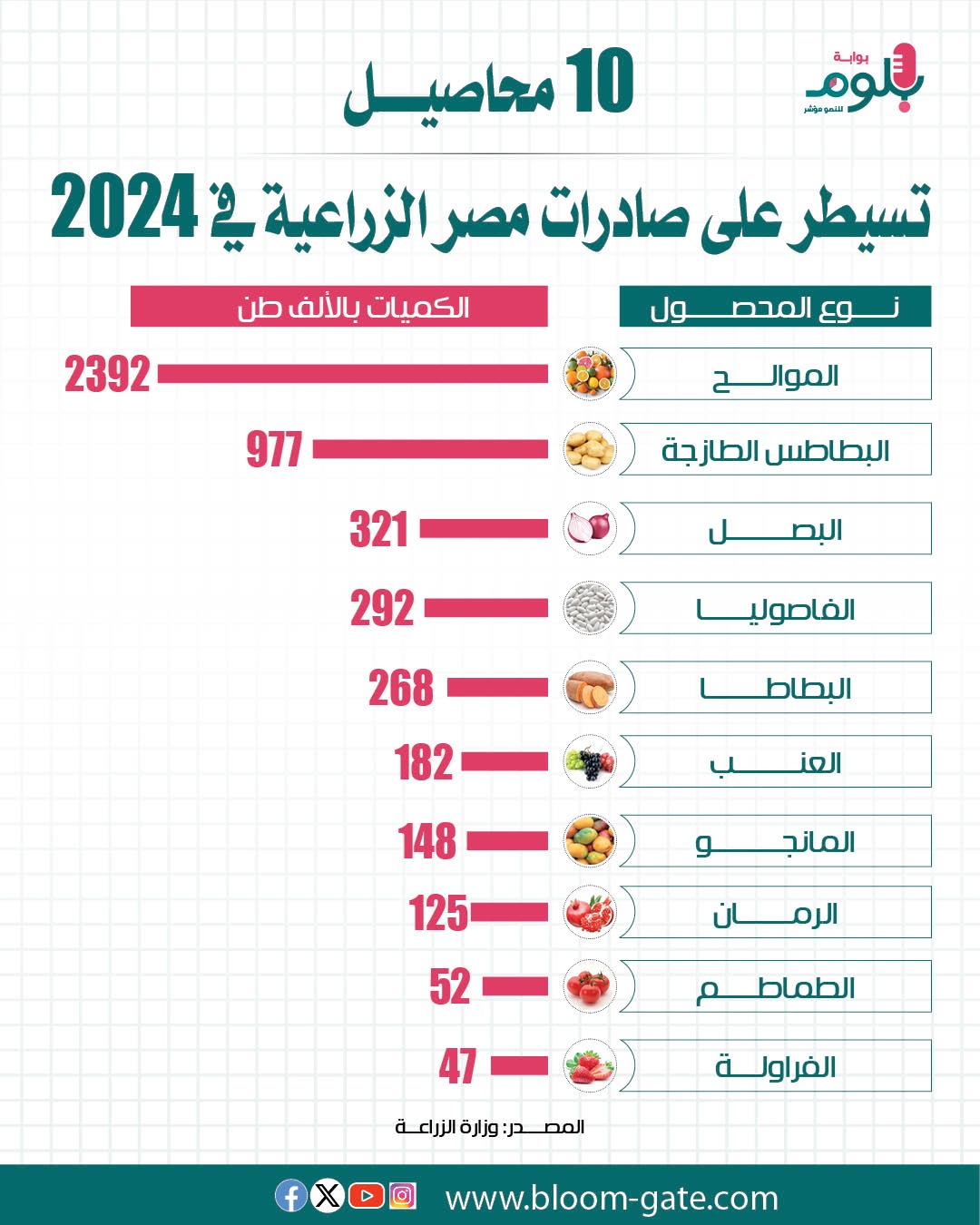 تحجز مصر مكاناً مميزاً في السوق العالمي للمحاصيل الزراعية على صعيد عدد من المحاصيل، مثل الموالح، والبطاطس، والبصل، والعنب، والفاصوليا، وغيرها من السلع الزراعية التي تغزو أسواق العالم المختلفة، ويستعرض الأنفوجراف التالي حجم صادرات أبرز 10 محاصيل زراعية مصرية.