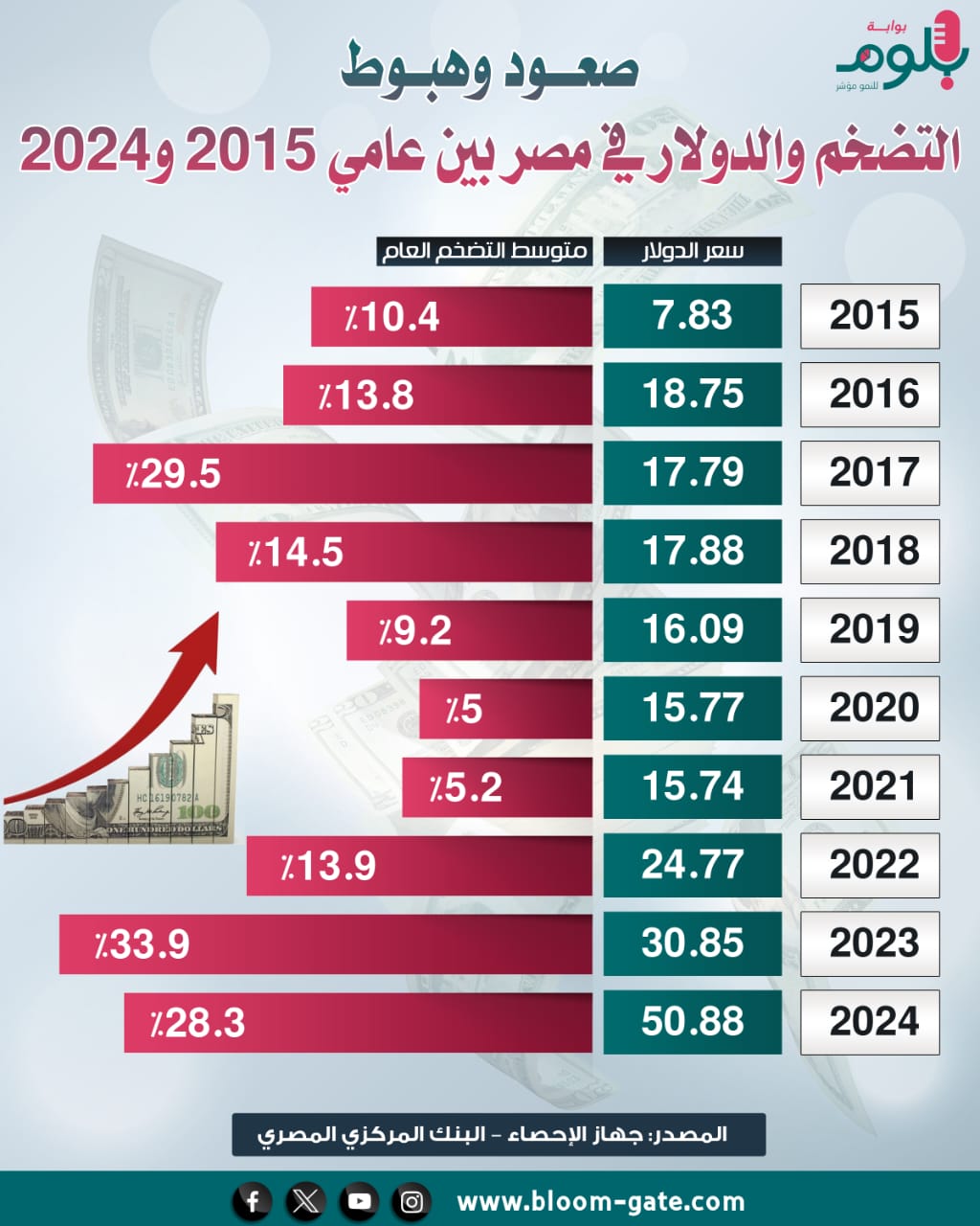 وعلى مدار السنوات الماضية ومع كل ارتفاع في أسعار صرف العملات أمام الجنيه فإن معدلات التضخم تتجه نحو الصعود بقوة، وذلك نتيجة اعتماد الأسواق في مصر على الاستيراد، وهو ما واجهته الحكومة خلال العامين الماضيين بتقليل فاتورة الاستيراد قدر المستطاع والاعتماد على المنتجات المحلية، حتى تممكن من ضبط سوق الصرف وتوفير سيولة دولارية، ولوقف صعود التضخم، وفي الإنفوجراف الآتي سوف نستعرض تطور معدلات التضخم وسعر صرف الدولار منذ عام 2015 وحتى نهاية 2024.