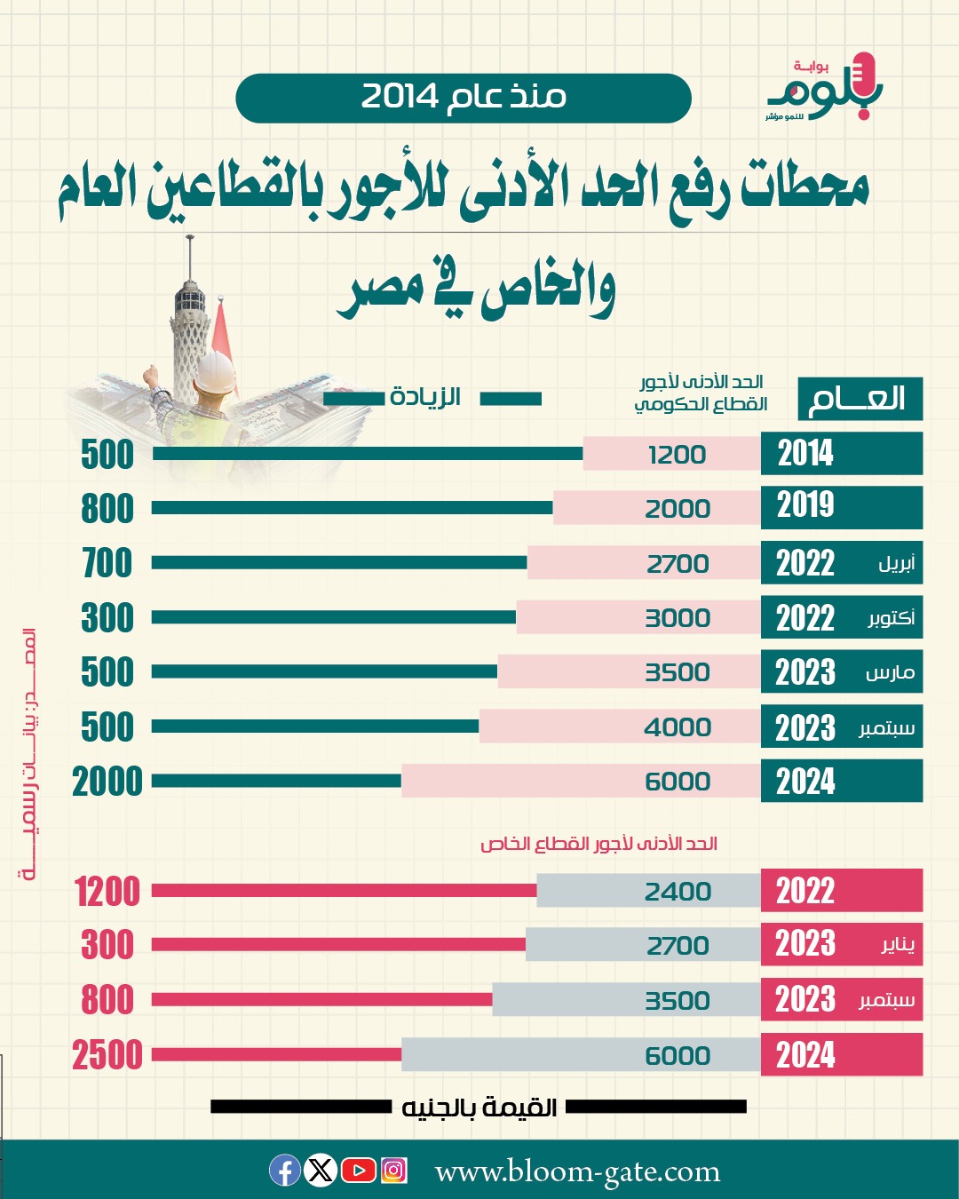 شهد الحد الأدنى للأجور ارتفاعاً منذ عام 2011 حتى نهاية العام الماضي 2024، حيث كانت زيادة الحد الأدنى ضرورية لاسيما في ظل 4 مرات تعويم لسعر صرف الجنيه خلال هذه الفترة في ضوء نقص الموارد الدولارية، إذ عملت الدولة على رفع قيمة الحد الأدنى لدعم المواطنين وتعزيز قدراتهم في مواجهة التقلبات الاقتصادية، وهو ما يوضحه الإنفوجراف القادم.