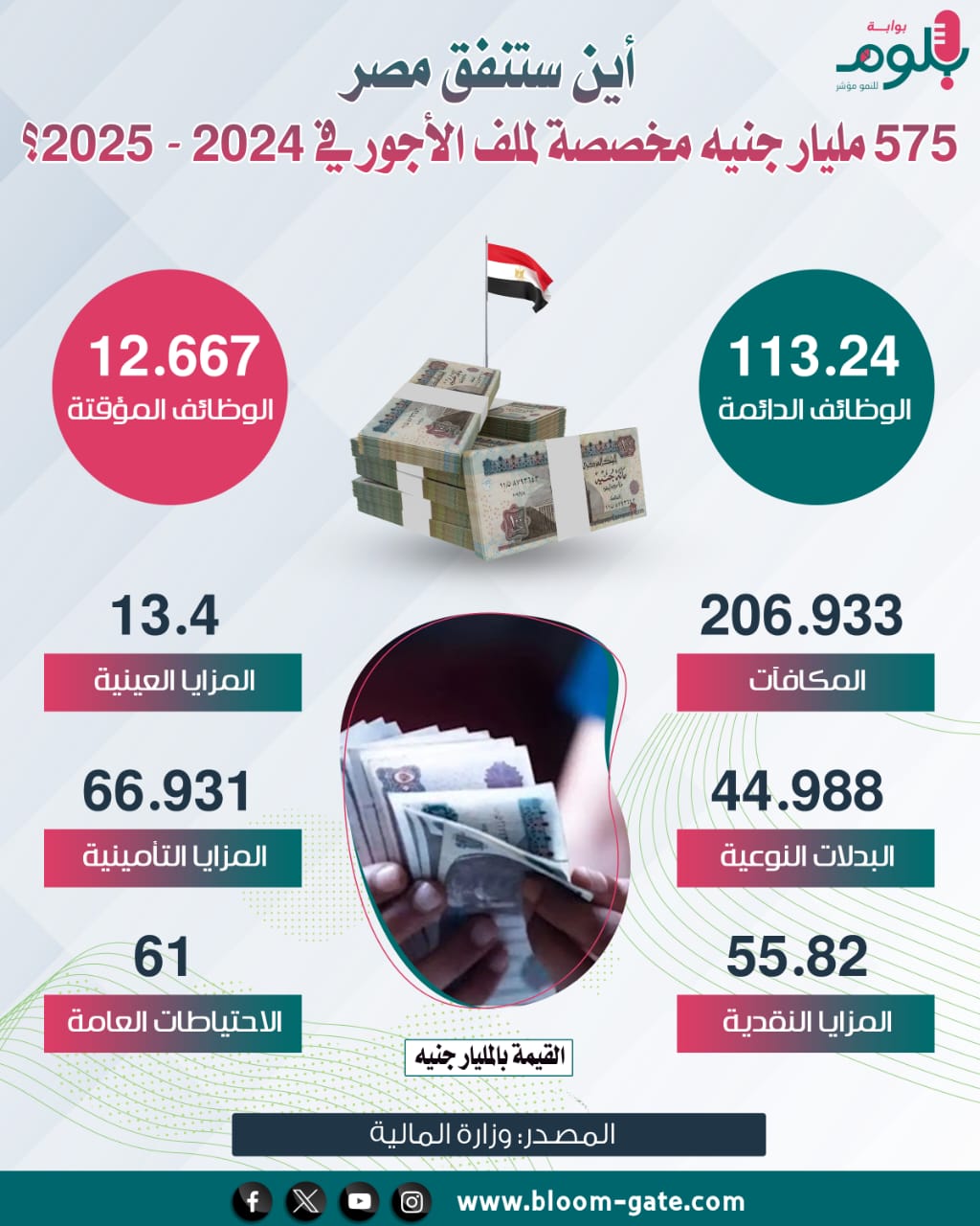 تتوزع مخصصات الأجور وتعوضيات العاملين بين 8 أبواب رئيسية تشمل الوظائف الدائمة، ونظيرتها المؤقتة، والمكافآت، والبدلات النوعية، والمزايا النقدية، والمزايا العينية، والمزايا التأمينية، والاحتياطات العامة، ويستعرض الإنفوجراف الآتي أوجه صرف مخصصات الأجور بهذه الأبواب.