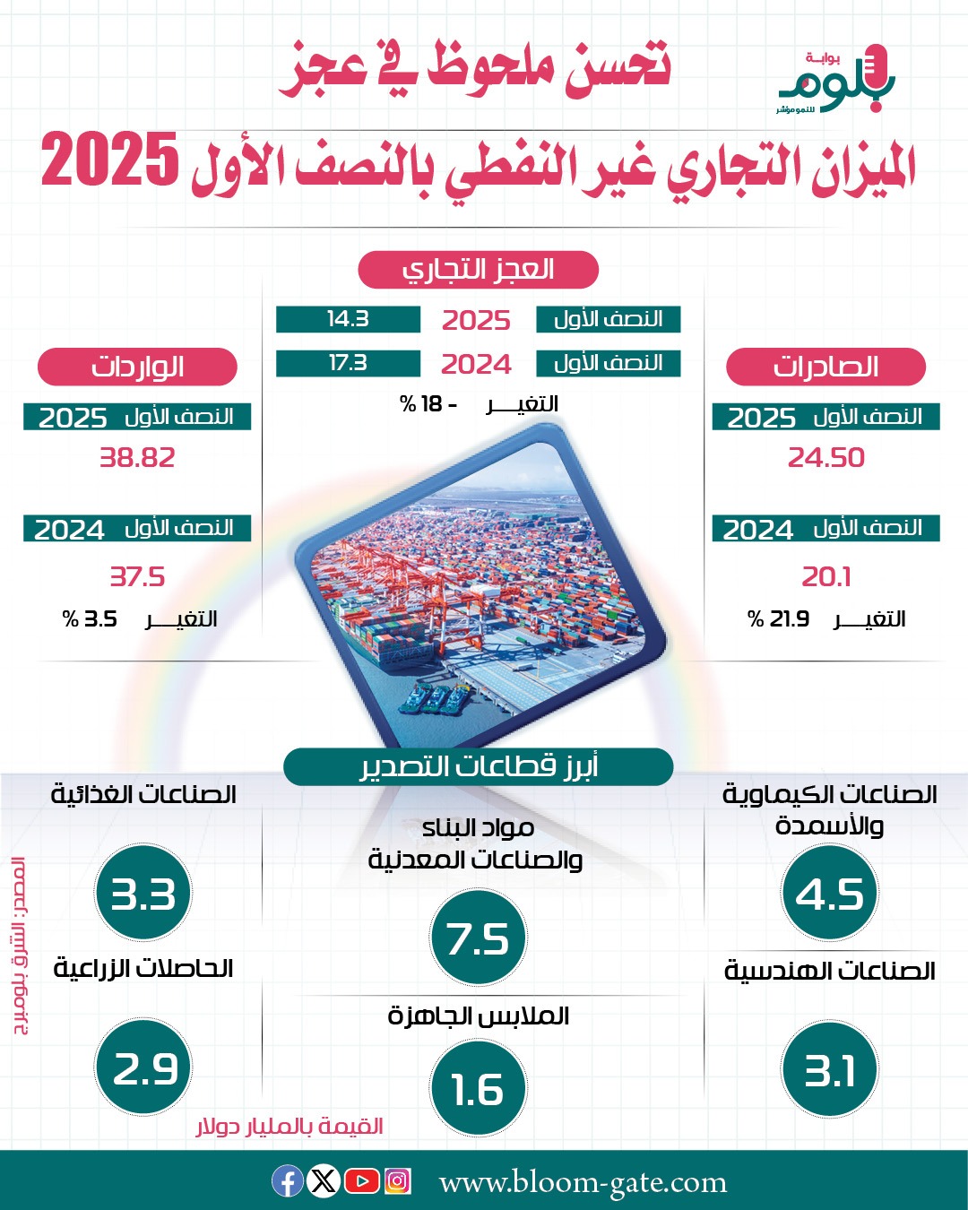 هبط عجز ميزان مصر التجاري غير النفطي بنحو 18% على أساس سنوي إلى 14.3 مليار دولار خلال النصف الأول من 2025، بدعم من الارتفاع الكبير في الصادرات مُقارنةً بنفس الفترة من العام الماضي، مسجلاً أكبر تراجع في 6 سنوات، وهو مؤشر على تحسن نسبي في التعاملات الخارجية المصرية، ما قد يشكل دعماً لسعر الصرف، ونرصد في هذا الإنفوجراف التحسن المحقق في الميزان التجاري السلعي في أول 6 أشهر من العام الجاري.