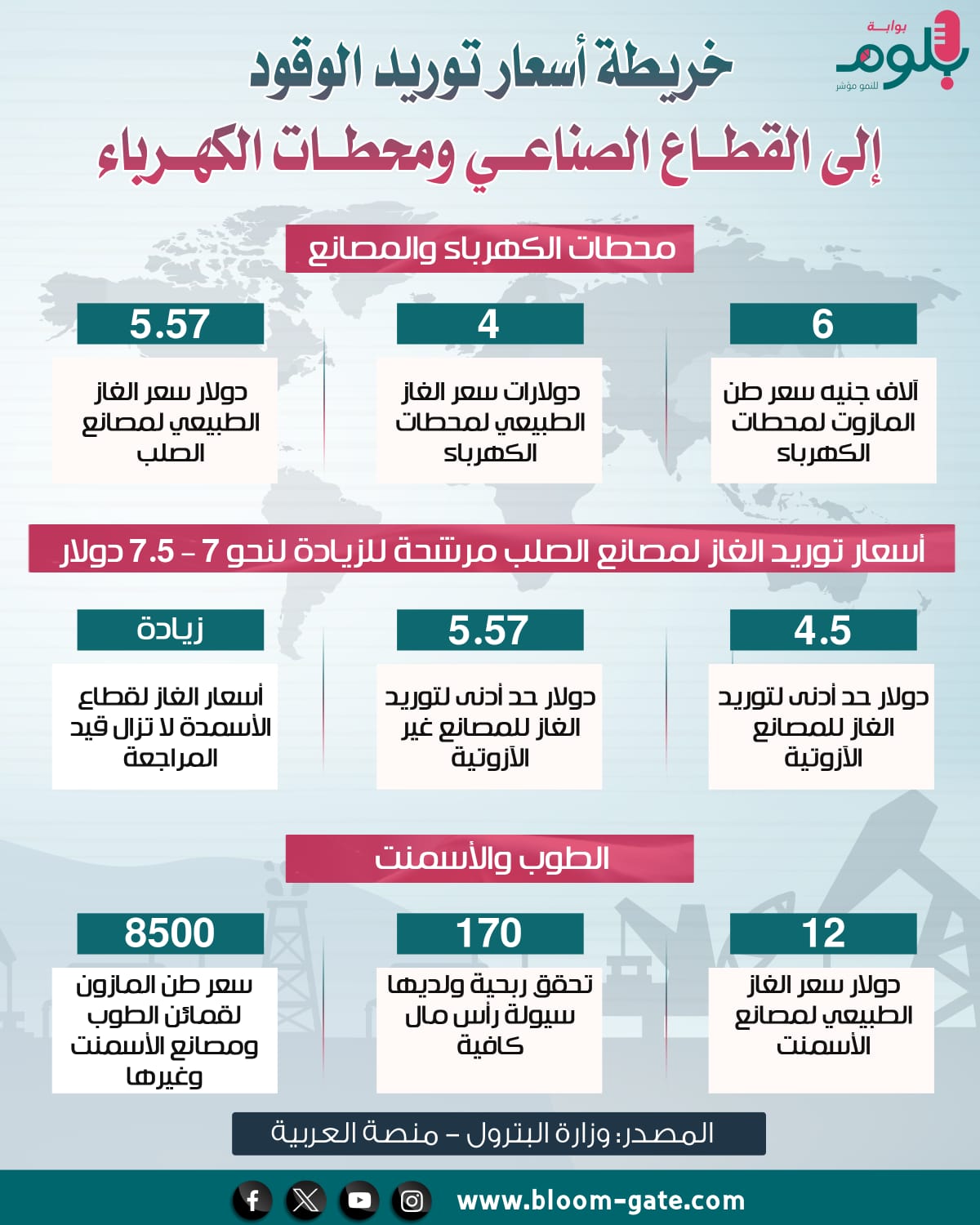 ولن تكون الصناعة بعيداً عن مشهد ارتفاع أسعار النفط العالمي، في ظل انتهاج الحكومة توجهاً بتمرير جانب من الزيادة في التكاليف إلى القطاع المستفيدة من الوقود، وهو ما تم خلال الأعوام الأخيرة بزيادة متتالية لأسعار الغاز الطبيعي والمازوت والسولار الموجه للعديد من القطاعات، وعلى رأسها الأسمدة والحديد والأسمنت والطوب ومحطات الكهرباء، وفي الإنفوجراف الآتي سوف نسلط الضوء على خريطة أسعار توريد الوقود إلى القطاع الصناعي ومحطات الكهرباء.