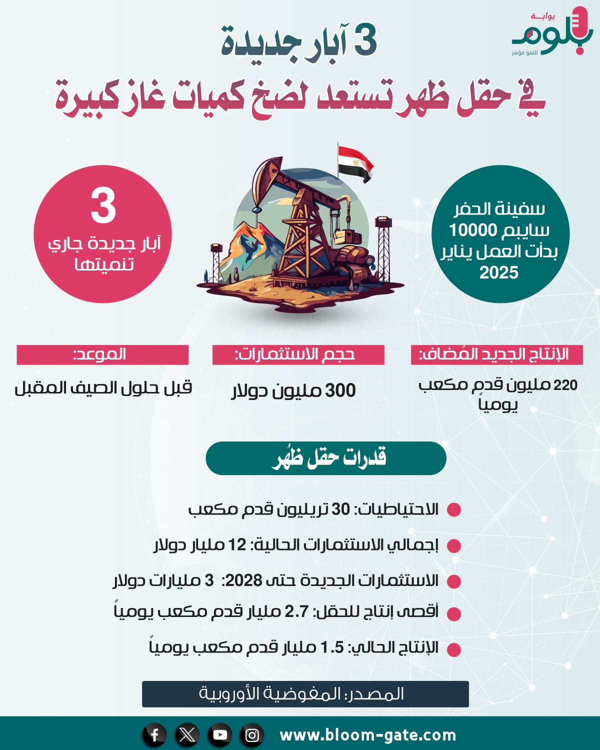 وتستهدف مصر زياد إنتاج حقل ظهر أكبر حقول الغاز في البحر المتوسط بعد وصول الحفار «سايبم 10000» بعد عودته لموقع الحقل نهاية يناير الماضي، ما يشكل دفعة جيدة لتعزيز إنتاج البلاد من الغاز لاسيما قبل حلول فصل الصيف، وزيادة الوفرة التي تحتاج إليها البلاد خلال الفترة المقبلة، بحسب ما كشفته وزارة البترول والعديد من التقارير، وهو ما يسلط الإنفوجراف التالي الضوء عليه.