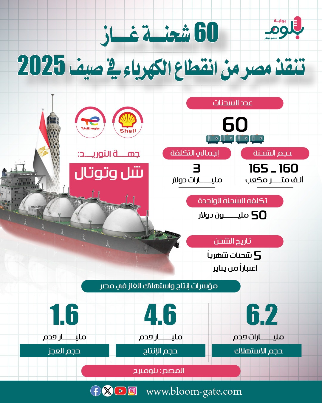 وتعتمد مصر في تعويض العجز بين حجم الإنتاج والاستهلاك من الغاز الطبيعي والذي يصل في المتوسط إلى 1.7 مليار قدم مكعب سنوياً على استيراد الغاز المسال، وبحسب منصة «اقتصاد الشرق مع بلومبرج» تعاقدت مصر على استيراد عشرات الشحنات سوف يتم إلقاء الضوء عليها في هذا الإنفوجراف.