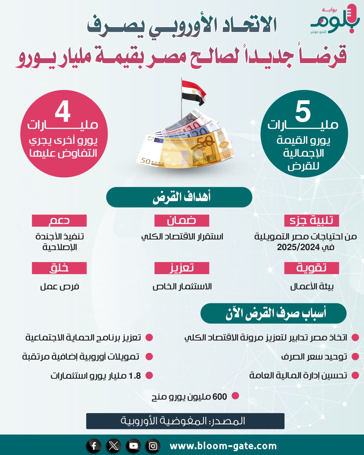 وبالتزامن مع انتظار مصر لإقرار المراجعة الرابعة، فإن المفوضية الأوروبية وافقت يوم الجمعة الماضي، على صرف مليار يورو لمصر ضمن قرض بقيمة 5 مليارات يورو، بعدما استوفت الحكومة المصرية شروط اتفاق وقعته مع الاتحاد الأوروبي في وقت سابق من العام الجاري، في إطار اتفاق الشراكة الاستراتيجية والشاملة الذي وقعه الجانبان في يونيو الماضي، ويستعرض الإنفوجراف التالي تفاصيل القرض وأهدافه.