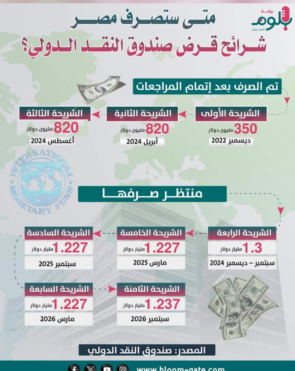 تبلغ قيمة برنامج التسهيل الممدد وفق اتفاق مصر مع الصندوق 8 مليارات دولار، ويتوزع البرنامج على 7 شرائح تمتد من ديسمبر 2023 حتى مارس 2026، تمكنت البلاد حتى الآن من الحصول على 3 شرائح بإجمالي مبلغ 1.99 مليار دولار، أولها كان في ديسمبر 2022 بقيمة 350 مليون دولار، والثانية في مارس 2024 بقيمة 820 مليون دولار، والثالثة بقيمة مماثلة في أغسطس الماضي بقيمة 820 مليون دولار، وتنتظر الآن صرف الشريحة الرابعة بقيمة 1.3 مليار دولار، وسوف نستعرض الجدول الزمني لصرف الشرائح في الإنفوجراف الآتي.