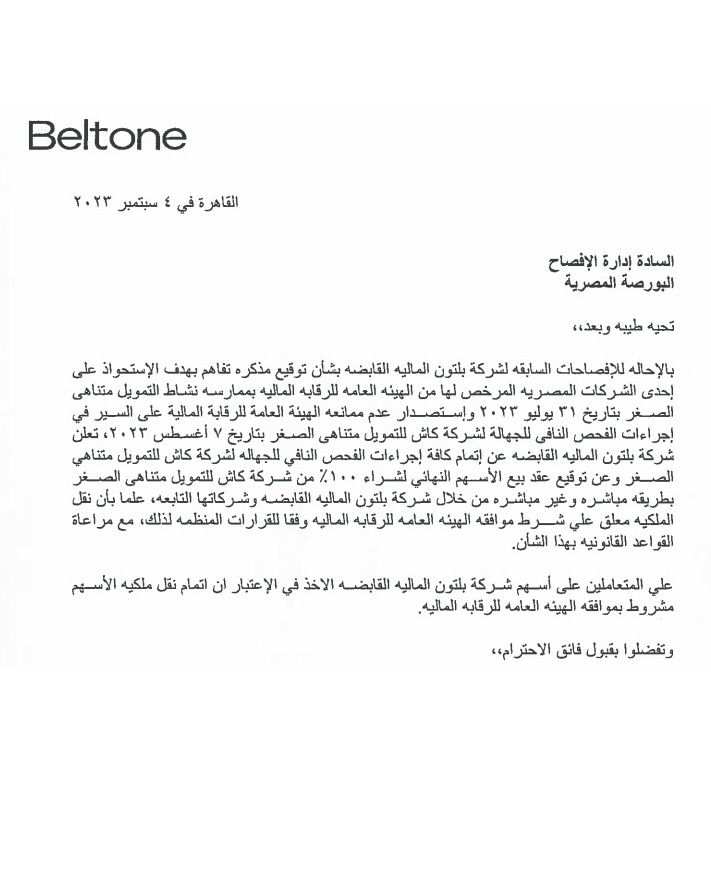 انتهت شركة بلتون القابضة من إجراءات الفحص النافي للجهالة لشركة كاش للتمويل متناهي الصغر، ووقعت عقد شراء 100% من أسهم شركة كاش، بطريقة مباشرة وغير مباشرة، من خلال شركة بلتون المالية القابضة وشركاتها التابعة.