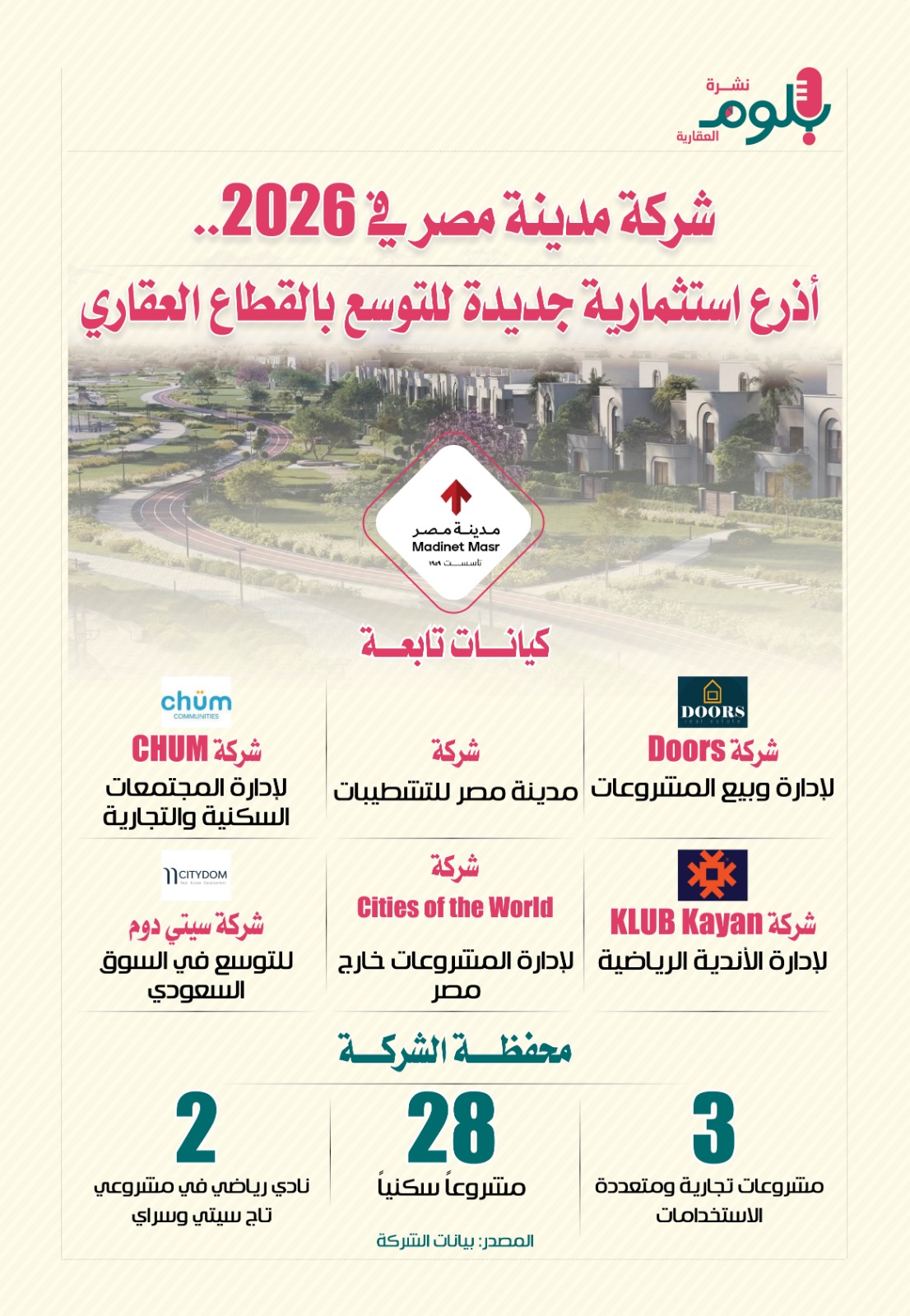 تخطط شركة مدينة مصر لمواصلة خطتها التوسعية داخل وخارج مصر، خلال العام الجاري، من خلال الأذرع الاستثمارية التي أطلقتها، ومنصاتها التابعة لها، وفق المسح الذي أجرته نشرة بلوم العقارية، كيانات متخصصة في إدارة المجتمعات، والتشطيبات، وإدارة الأندية، وأخرى للمشروعات الخارجية، إلى جانب منصاتها التي تعمل تحت مظلة ذراعها للابتكار، وفي الإنفوجراف الآتي سوف نستعرض تفاصيل تلك الأذرع.