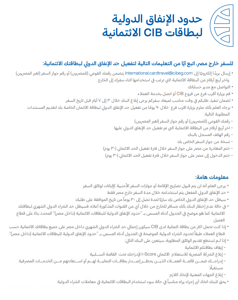 ورفع CIB حدود الاستخدام على كافة البطاقات الائتمانية داخل وخارج مصر وفقاً لنوع كل قطاع، كما خفض الهامش على أسعار صرف العملات الأجنبية لجميع البطاقات ليصبح 5% بدلًا من 10%.