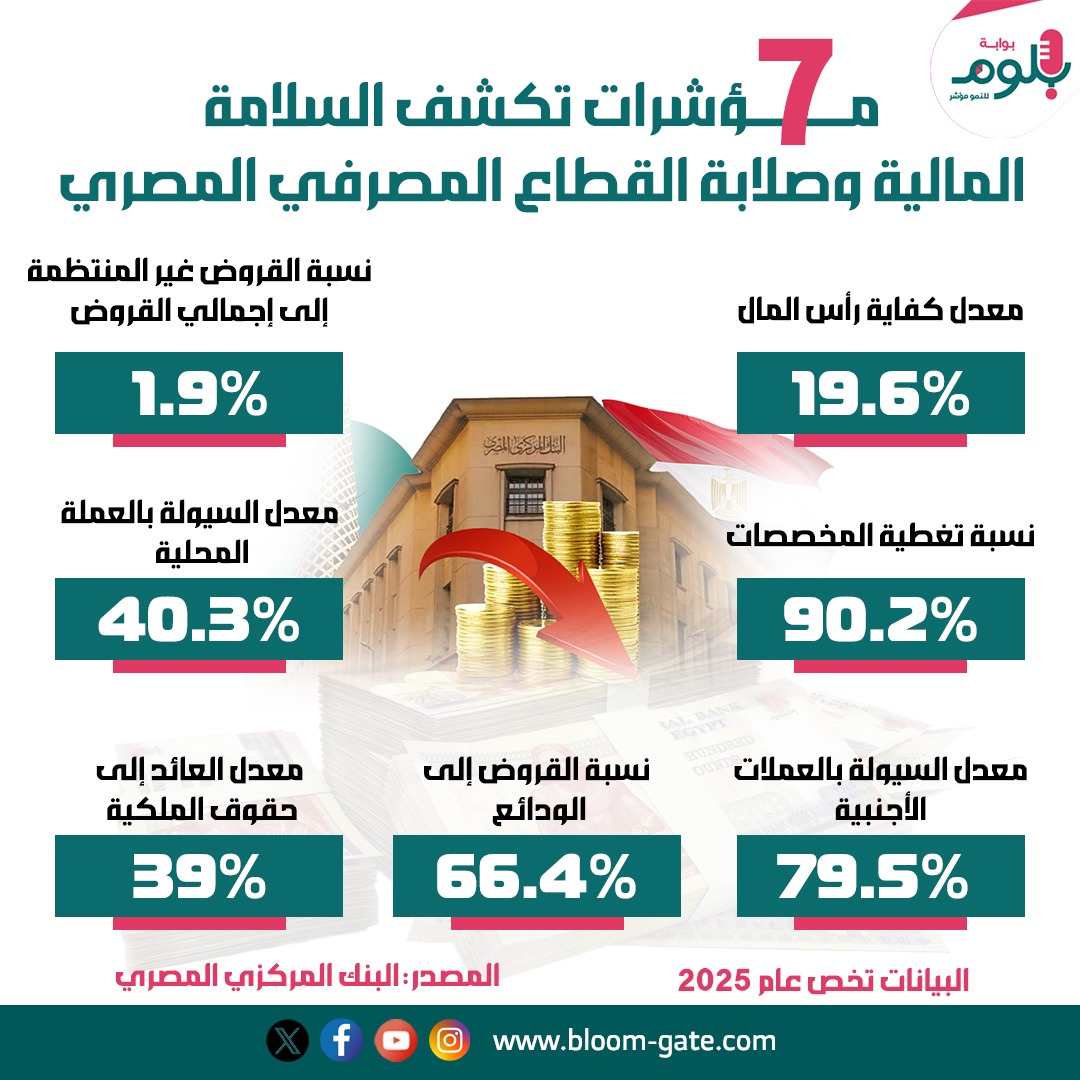 أظهرت مؤشرات السلامة المالية صلابة وقوة القطاع المصرفي كأحد الركائز التي تعتمد عليها الدولة لتحقيق الاستقرار الاقتصادي المالي والنقدي من خلال قدرته على توفير التمويل لقطاعات النشاط الاقتصادي المختلفة بما ينعكس على زيادة الناتج القومي وتحقيق معدلات نمو واستثمار عالية وخلق فرص متاحة للعمل لكافة المواطنين، ويمكن الإطلاق على مؤشرات صلابة القطاع المالي لعام 2025 في هذا الإنفوجراف.
