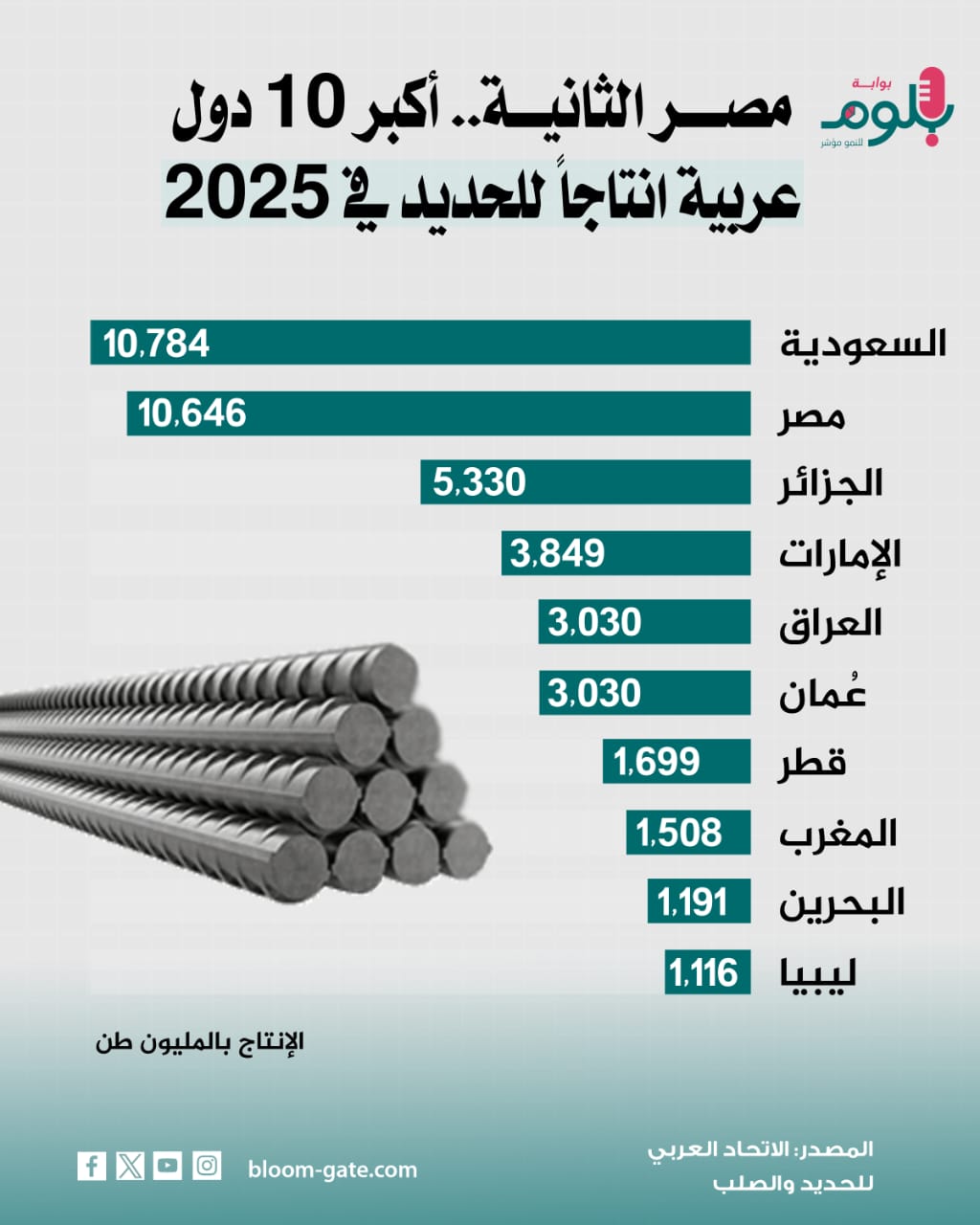 سجّل إنتاج صناعة الصلب في الدول العربية نمواً على أساس سنوي بنسبة 7.2% خلال عام 2025 ليصل إلى 43.7 مليون طن، وذلك في ضوء نمو إنتاج دول الخليج بنحو 9.5% مسجلاً 21.638 مليون طن مع نمو إنتاج دول شمال أفريقيا 6% إلى 18.676 مليون طن، في حين تراجع إنتاج مصر بمقدار 0.8% إلى 10.645 مليون طن، ونستعرض ذلك في الإنفوجراف الآتي.