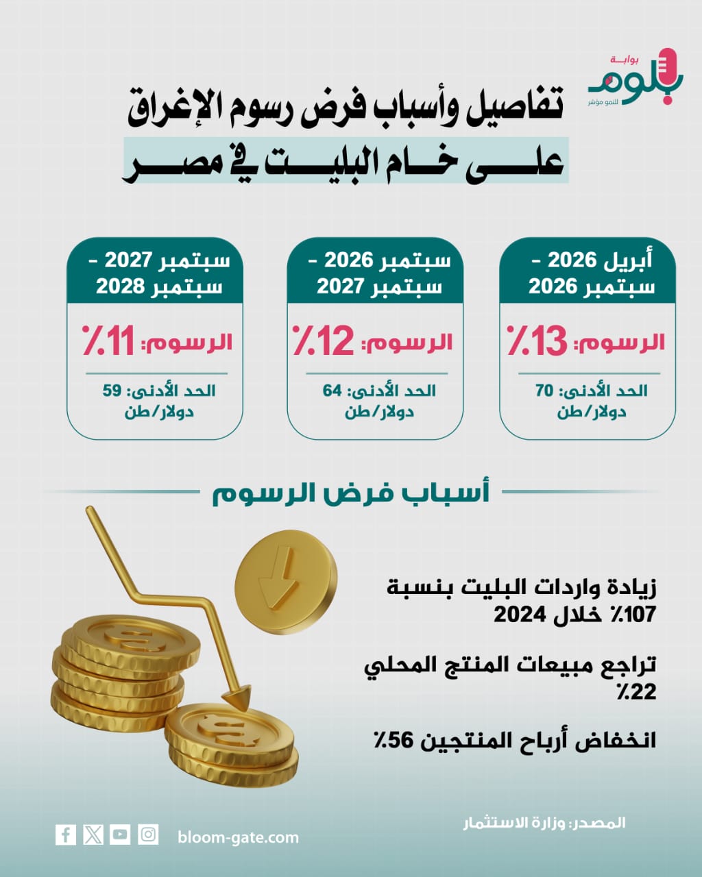 بدأت وزارة الاستثمار والتجارة الخارجية في تطبيق رسوم إغراق جديدة على واردات البليت اعتباراً من أبريل الحالي حتى سبتمبر 2028، وذلك بعد انقضاء قرار سابق بفرض بنحو 16.5% أو ما لا يقل عن 4613 جنيهًا للطن، وذلك في ضوء الأضرار التي تلحق بمصانع الدورة المتكاملة المصرية المُصنّعة للبليت على حد وصف الوزارة، ونستعرض في الإنفوجراف التالي نسب الرسوم خلال 3 سنوات وأسباب تطبيقها.