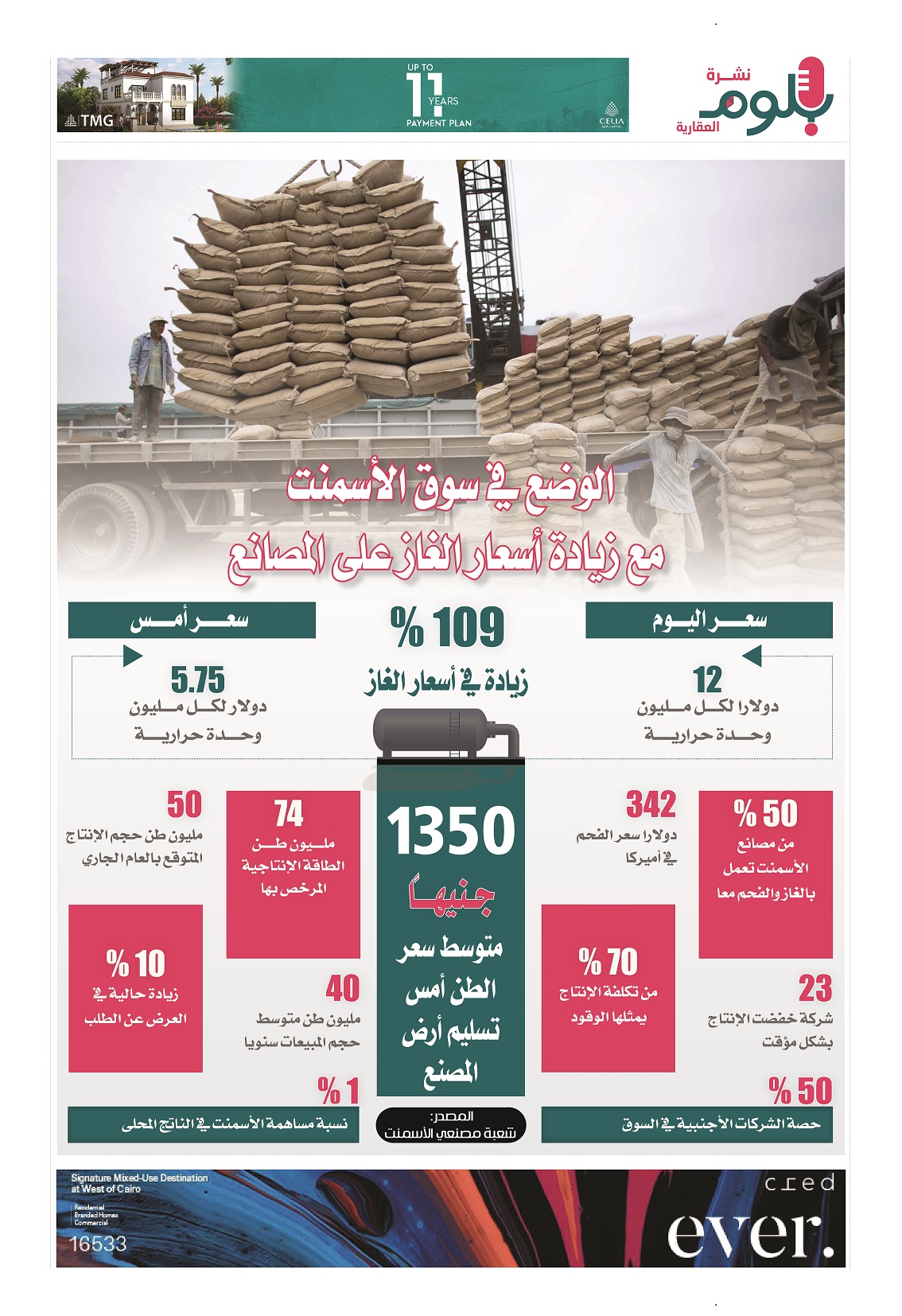 أصدر الدكتور مصطفى مدبولي، رئيس الوزراء، أمس قرارا بتحديد سعر بيع الغاز الطبيعي المورد لصناعة الأسمنت بواقع 12 دولارا لكل مليون وحدة حرارية بريطانية، وهو ما يمثل ارتفاعا بنسبة 109% عن الأسعار التي كان يتم التعامل بها والتي كانت محطة بنحو 5.75 دولار، وهو ما سيكون له تبعا محتملة على السوق، وفي الإنفوجراف الآتي سوف نسلط الضوء على سوق الأسمنت، في محاولة لرصد الوضع والتعرف على أي تغيرات قد تطرأ نتيجة القرار.