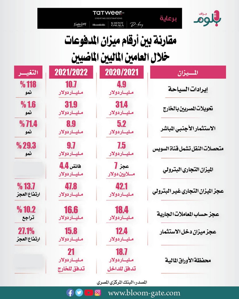 وفي إصدار اليوم من «بلوم جراف» سوف نسلط الضوء على الأرقام التي تضمنها التقرير، وما هي التغيرات التي شهدتها، خاصة في ظل المساعي التي تقوم بها الحكومة والبنك المركزي، للحفاظ على استقرار الاقتصاد، وخاصة ما يتعلق بالعملات الصعبة، وسنبدأ في الإنفوجراف الآتي بمقارنة المعدلات التي تحققت خلال العام المالي الماضي، في مقابل ما شهده العام المالي 2020/2021.