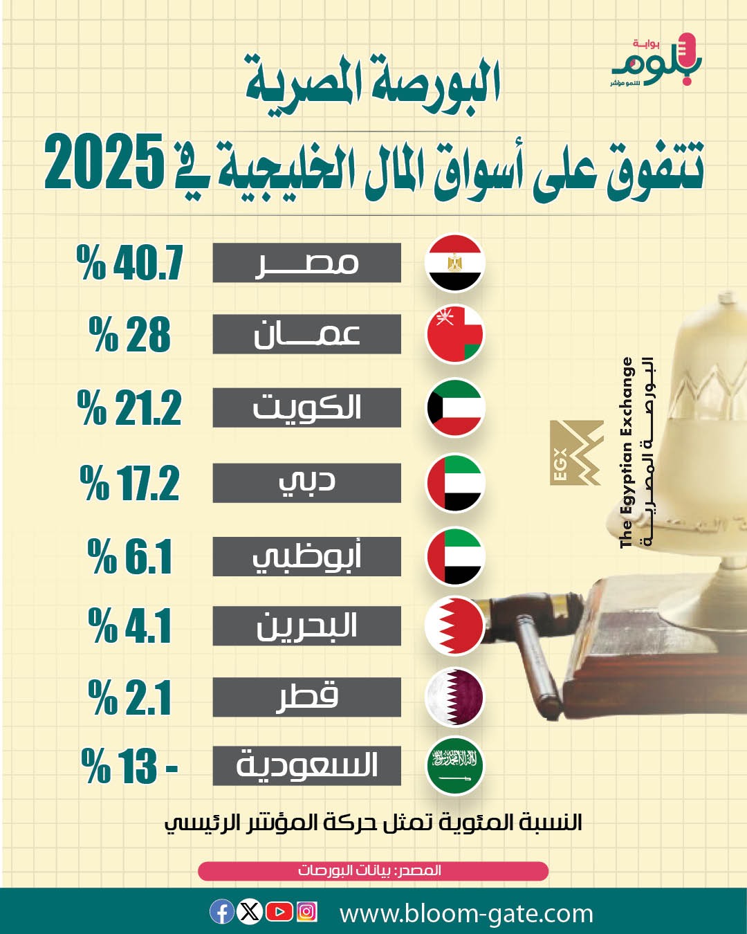 تفوقت البورصة المصرية على أسواق المال الخليجية في 2025 بتحقيق الأداء الافضل على الٱطلاق، على الرغم من غلبة الصعود على بورصات الخليج العام الماضي باستثناء سوق المال السعودية التي تكبدت خسائرًا، ويستعرض الإنفوجراف الآتي أداء بورصات مصر والخليج في 2026.