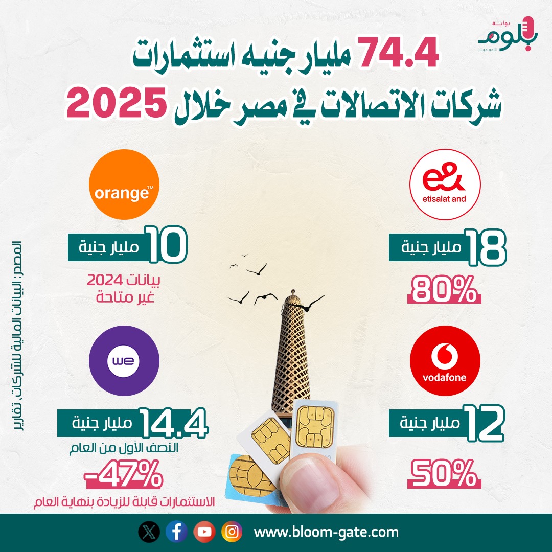 تتوسع شركات الاتصالات الأربعة في مصر باستثماراتها خلال عام 2025 باستثناء الشركة المصرية للاتصالات We، وتتركز استثمارات الشركات في رخص الجيل الخامس والترددات الخاصة بها، وتطوير البنية التحتية والأبراج وتحديث البرمجيات، فضلاً عن استثمارات مراكز البيانات وحلول الذكاء الاصطناعي وإنترنت الأشياء، ونطرح في هذا الإنفوجراف حجم استثمارات شركات فودافون، وأورانج، وإى آند، ووي خلال العام الحالي في مصر ومعدل تطورها.