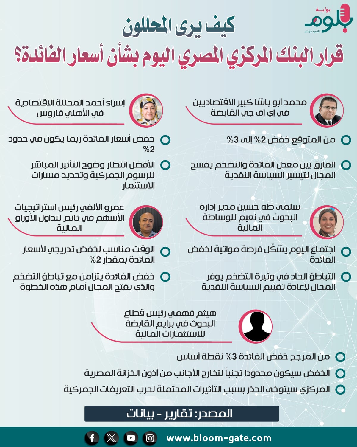 يعدد المحللون الأسباب التي قد يستند إليها البنك المركزي المصري لتحديد مصير أسعار الفائدة سواء كان القرار بخفض العائد أو التثبيت، ويسلط هذا الأنفوجراف الضوء على توقعات المحللين والعوامل الداعمة لها.