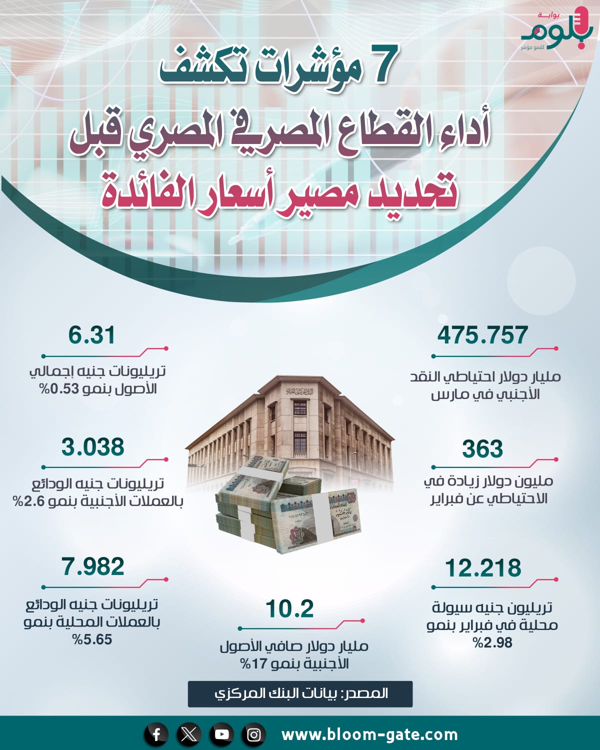 وتعكس أحدث المؤشرات المالية حدوث تحسناً في أداء القطاع المصرفي على صعيد الودائع والقروض، فضلاً عن تحسن موارد القطاع من النقد الأجنبي، ما انعكس على صافي الأصول الأجنبية واحتياطي النقد الأجنبي، ويرصد الإنفوجراف التالي أبرز مؤشرات أداء القطاع.