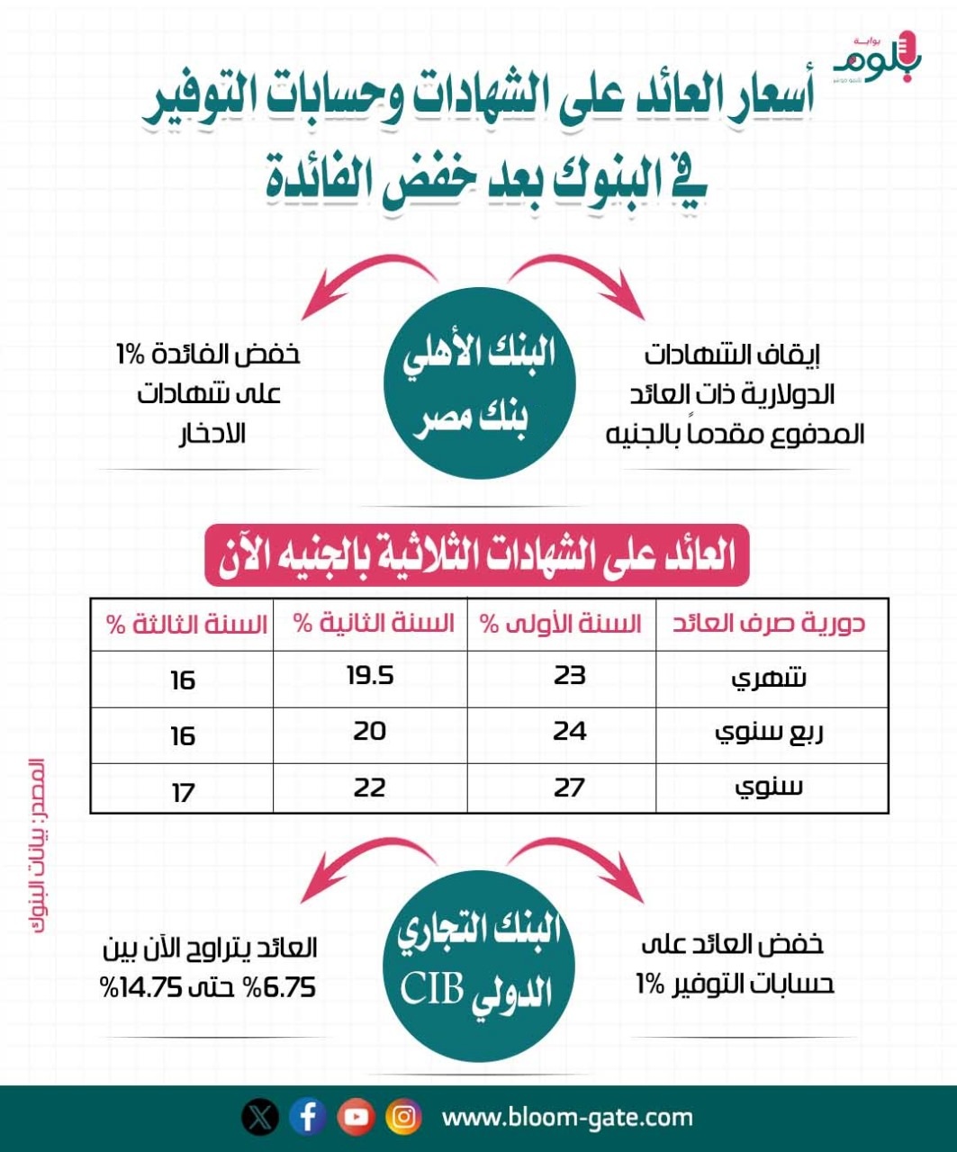 بدأ عدد من البنوك المصرية مراجعة أسعار الفائدة على شهادات الادخار وحسابات التوفير، إثر قرار البنك المركزي نهاية الأسبوع الماضي بخفض العائد على الإيداع والإقراض بنسبة 1%، ومن أبرز البنوك التي اتجهت لخفض الفائدة كل من البنك الأهلي المصري ومصر والتجاري الدولي، ويمكن معرفة أسعار العائد الآن على الشهادات وحسابات التوفير التي شهدت تغييراً من خلال الإنفوجراف التالي.