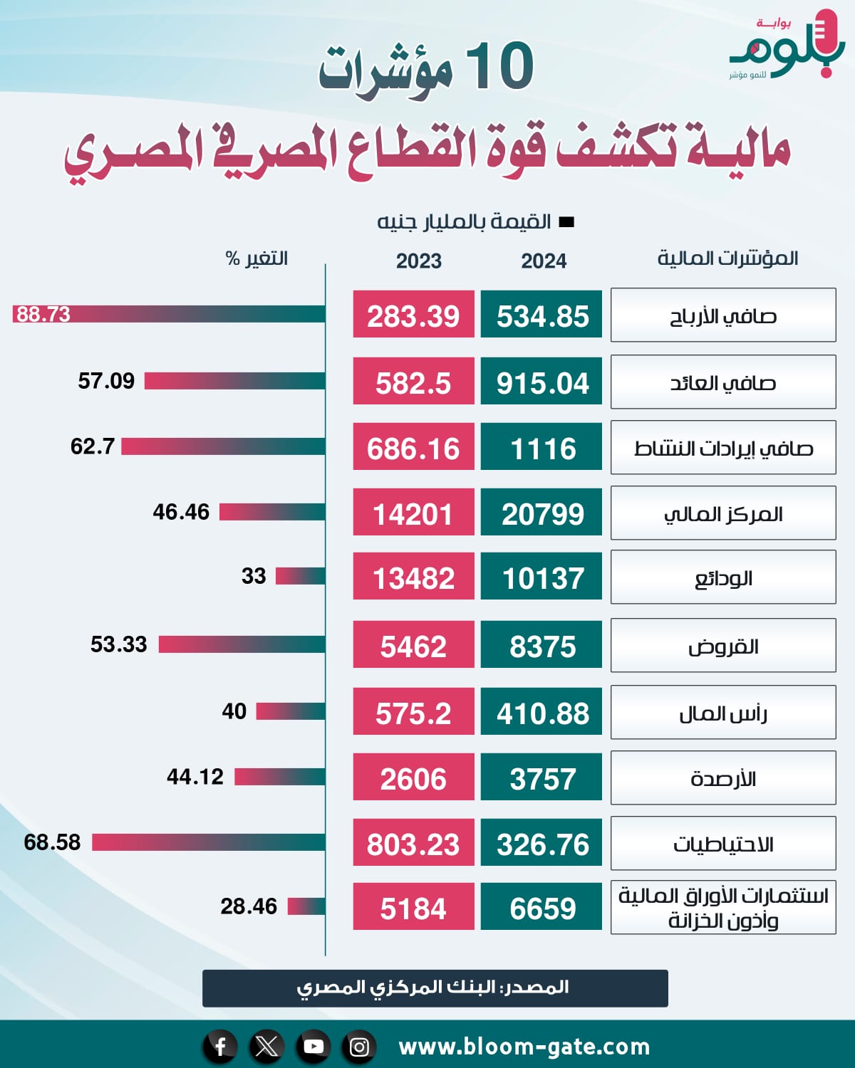 حققت البنوك المصرية أداءً جيداً خلال عام 2024، على صعيد العديد من المؤشرات المالية من حيث الأرباح والعائد والإيرادات والأصول، وكذلك الاستثمارات في محفظة أذون الخزانة والتي تشهد طفرة في ظل توسع الحكومة في إصدارات أدوات الدين، ويسلط الإنفوجراف القادم الضوء على الأداء المالي للبنوك.