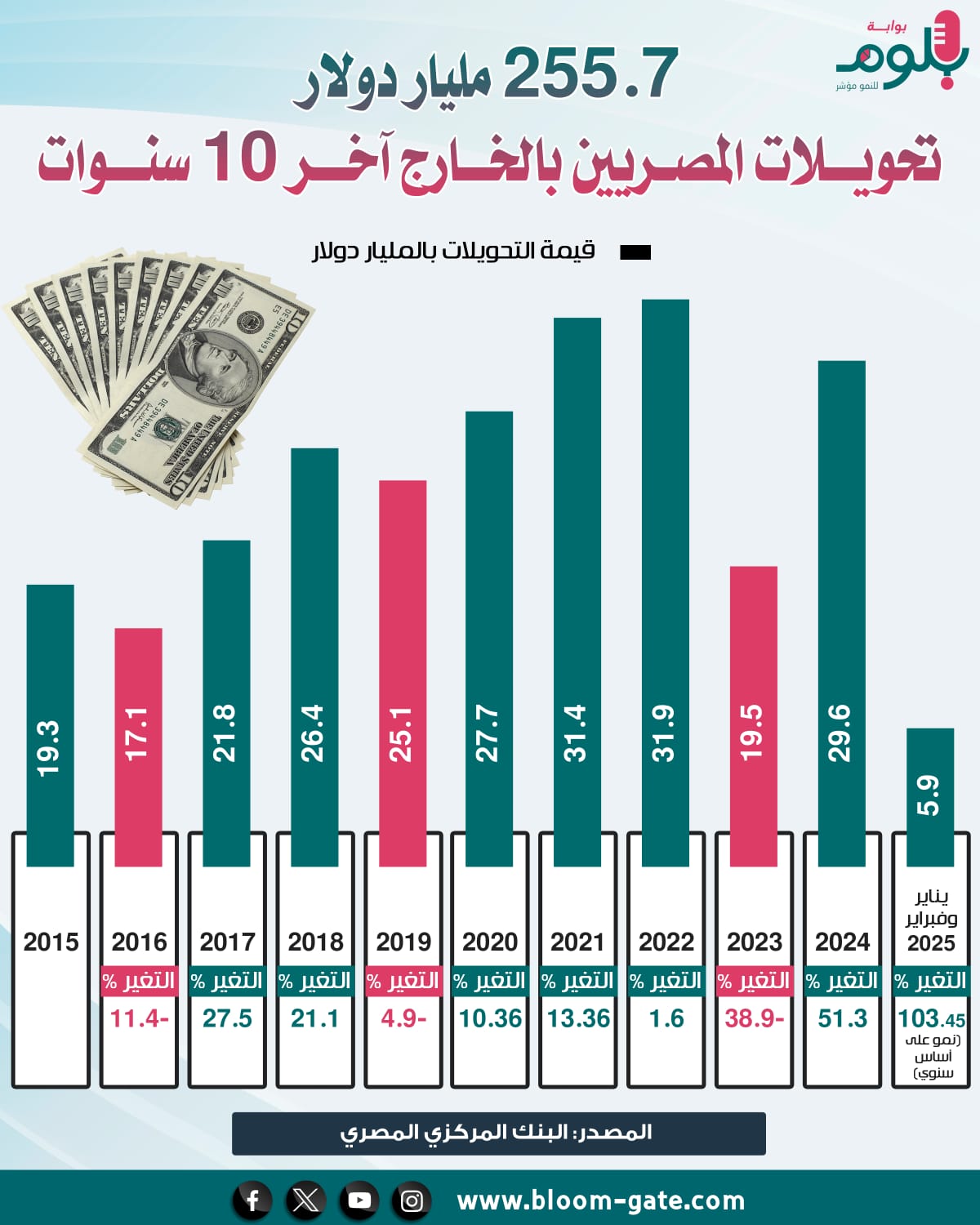 وتضمنت أهم أهداف البنوك المصرية من التوسع الخارجي في تيسير تحويلات المصريين المغتربين بالخارج والتي شهدت قفزة كبيرة منذ الإجراءات الإصلاحية التي اتخذتها الحكومة في مارس 2024، والتي تضمنت  تحرير سعر صرف الجنيه ما شجع العاملين بالخارج على تحويل الأموال والوصول بها إلى 29.6 مليار دولار العام الماضي بزيادة سنوية 51.3%، لتشكل أحد أهم مصادر النقد الأجنبي لمصر، ويستعرض هذا الإنفوجراف رحلة تحويلات المغتربين خلال آخر 10 سنوات.