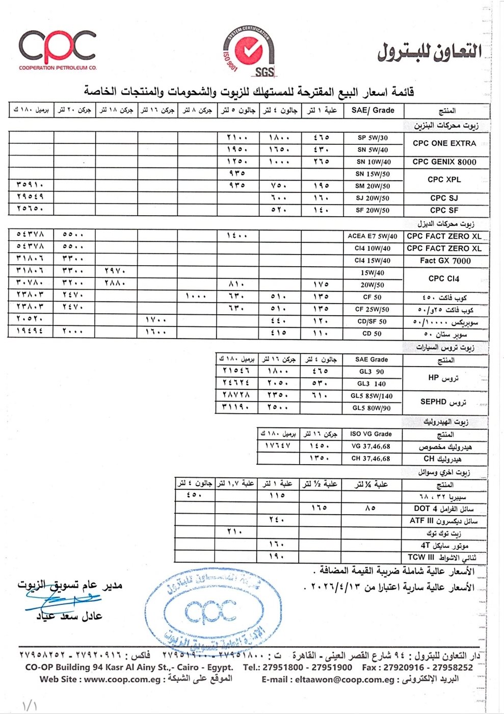 رفعت شركة التعاون للبترول أسعار زيوت السيارات والشحوم وزيوت التروس خلال شهر أبريل الجاري، على أن يبدأ تطبيق الزيادة اعتبارًا من غدًا الاثنين، الموافق 13 أبريل 2026.