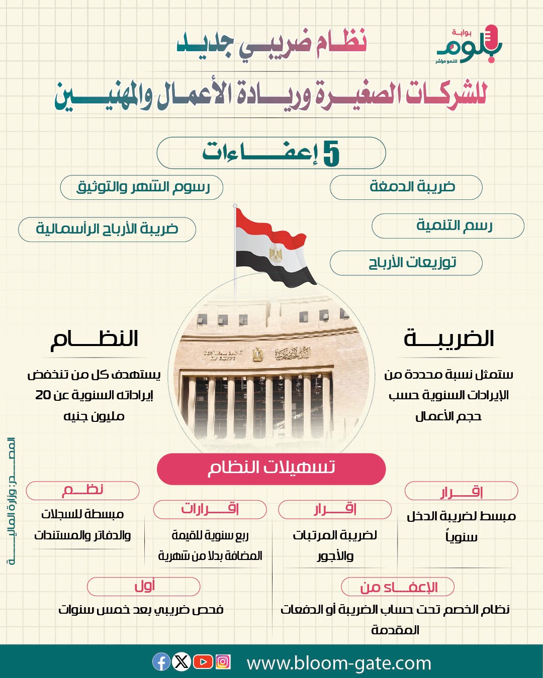وقطعت مصر خطوات على أرض الواقع لتحفيز مناخ الاستثمار، ومن بينها منح تيسيرات ضريبية لدمج الشركات الصغيرة في الاقتصاد الرسمي وتوفير فرض أفضل لتنمية حجم أعمالها، حيث وافق مجلس النواب مؤخراً على نظام ضريبي متكامل للممولين الذين لا يتجاوز إيراداتهم السنوية 20 مليون جنيه، ويشمل الشركات الصغيرة وأنشطة ريادة الأعمال والمهنيين، ويوفر هذا النظام الضريبي حوافز وإعفاءات وتيسيرات لكل أنواع الضرائب الدخل والقيمة المضافة والدمغة ورسم التنمية، فيما كشف وزير المالية أحمد كجوك عن نية إقرار تيسيرات جمركية وضريبية جديدة، وسنسلط الضوء في الإنفوجراف التالي على النظام الضريبي الجديد للشركات الصغيرة.