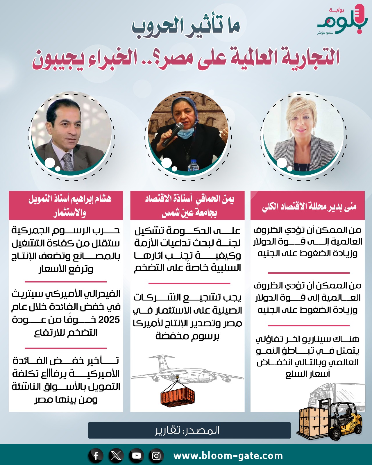 وتظل تداعيات الحرب التجارية العالمية المحتملة على مصر معقدة، لعدم معرفة مدى حجم الرسوم الحمائية المنتظرة وطبيعتها واتساع نطاقها، وما يمكن أن تسفر عنه من تباطؤ النمو العالمي، وإعادة تسعير السلع والخدمات مرة أخرى، وهي تطورات مثلما تحمل في طياتها تحديات قد تطرح ايضاً فرصاً للسلع المصرية، وهي التصورات التي يجيب عنها خبراء اقتصاد في الإنفوجراف الآتي.