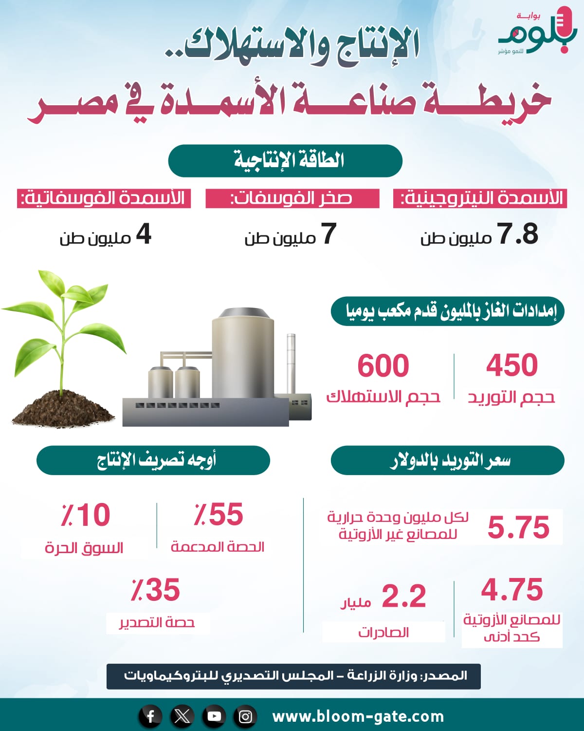 تتوزع خريطة إنتاج الأسمدة في مصر بين 3 مجالات رئيسية تشمل الأسمدة النيتروجينية ونظيرتها الفوسفاتية وصخر الفوسفات، وتعتمد بشكل أساسي على إمدادات الشركة المصرية القابضة للغازات الطبيعية «إيجاس»، ويستعرض هذا الإنفوجراف تفاصيل خريطة تلك الصناعة الحيوية من حيث الإنتاج وإمدادات الغاز وأوجه توزيع الإنتاج.