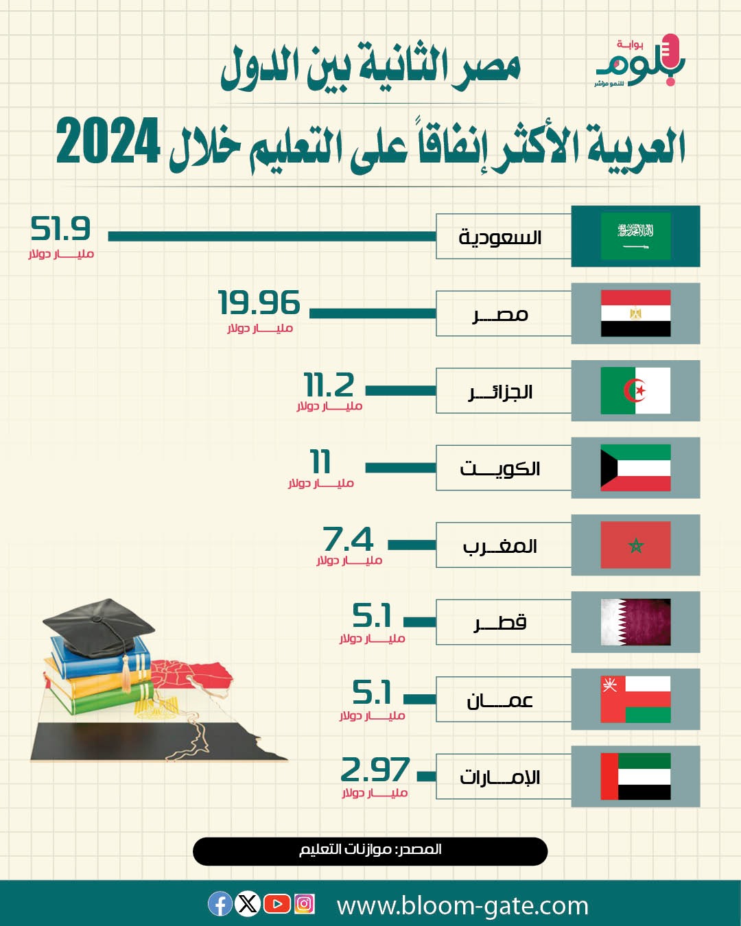 يتفاوت حجم الميزانيات المخصصة للتعليم في الدول العربية حسب المستوى الاقتصادي والكثافة السكانية، ومدى الاعتماد على القطاع الخاص لزيادة الاستثمار في التعليم وتقديم الخدمات التعليمية، إلى جانب الأهداف التي تصبو كل دولة لإحرازها عن طريق المنظومة التعليمية، ويستعرض هذا الإنفوجراف ترتيب أكثر الدول العربية إنفاقاً على التعليم.