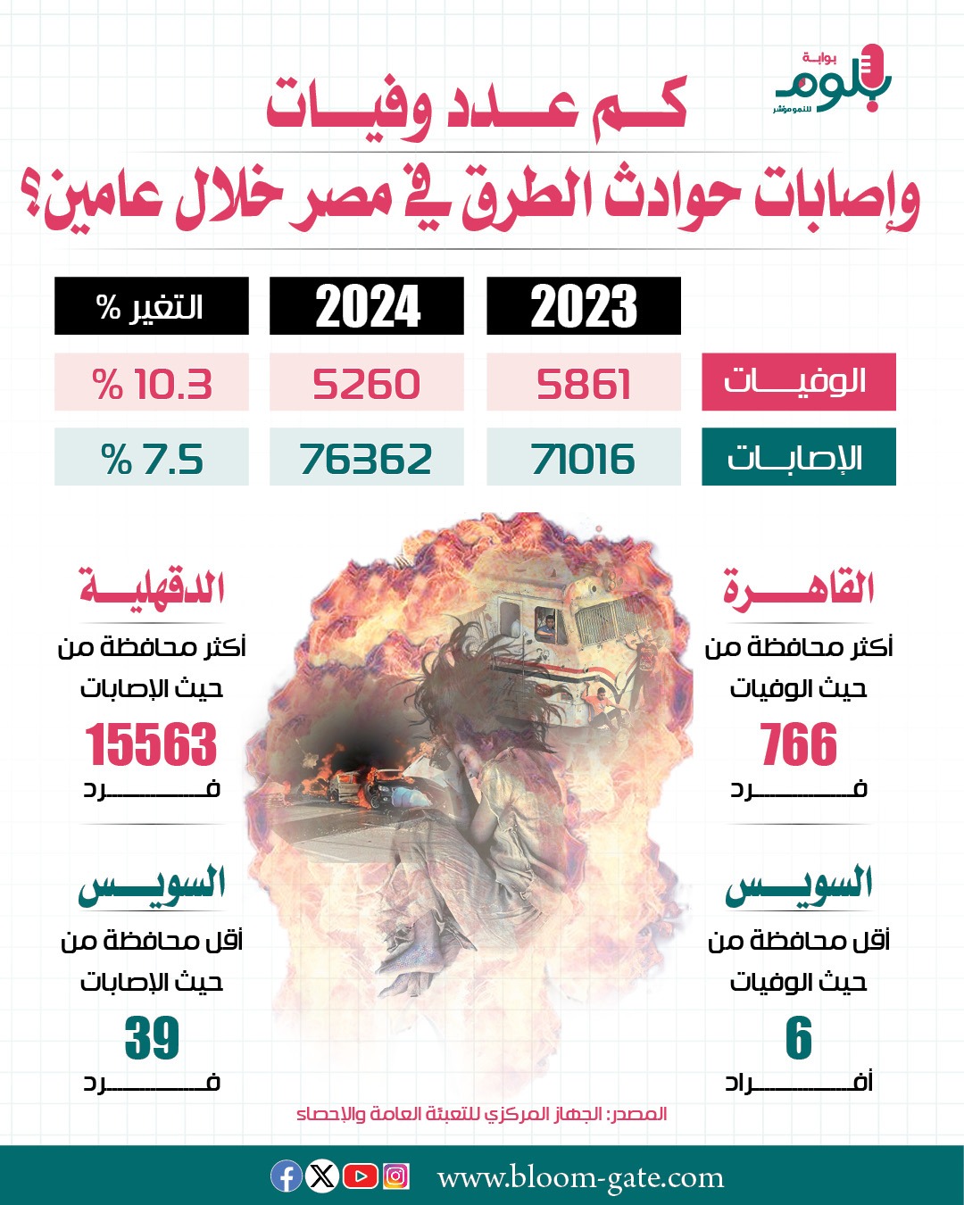 وعلى الرغم من الاستثمارات الضخمة التي تنفذها الدولة في ملف الطرق، إلا إن إحصاءات الجهاز المركزي للتعبئة العامة والإحصاءات تكشف ارتفاع أعداد الإصابات والوفيات الناجمة عن حواد الطرق في أنحاء البلاد سواء في الوجه البحري أو الوجه القبلي، وهو ما سيرصده الإنفوجراف التالي.