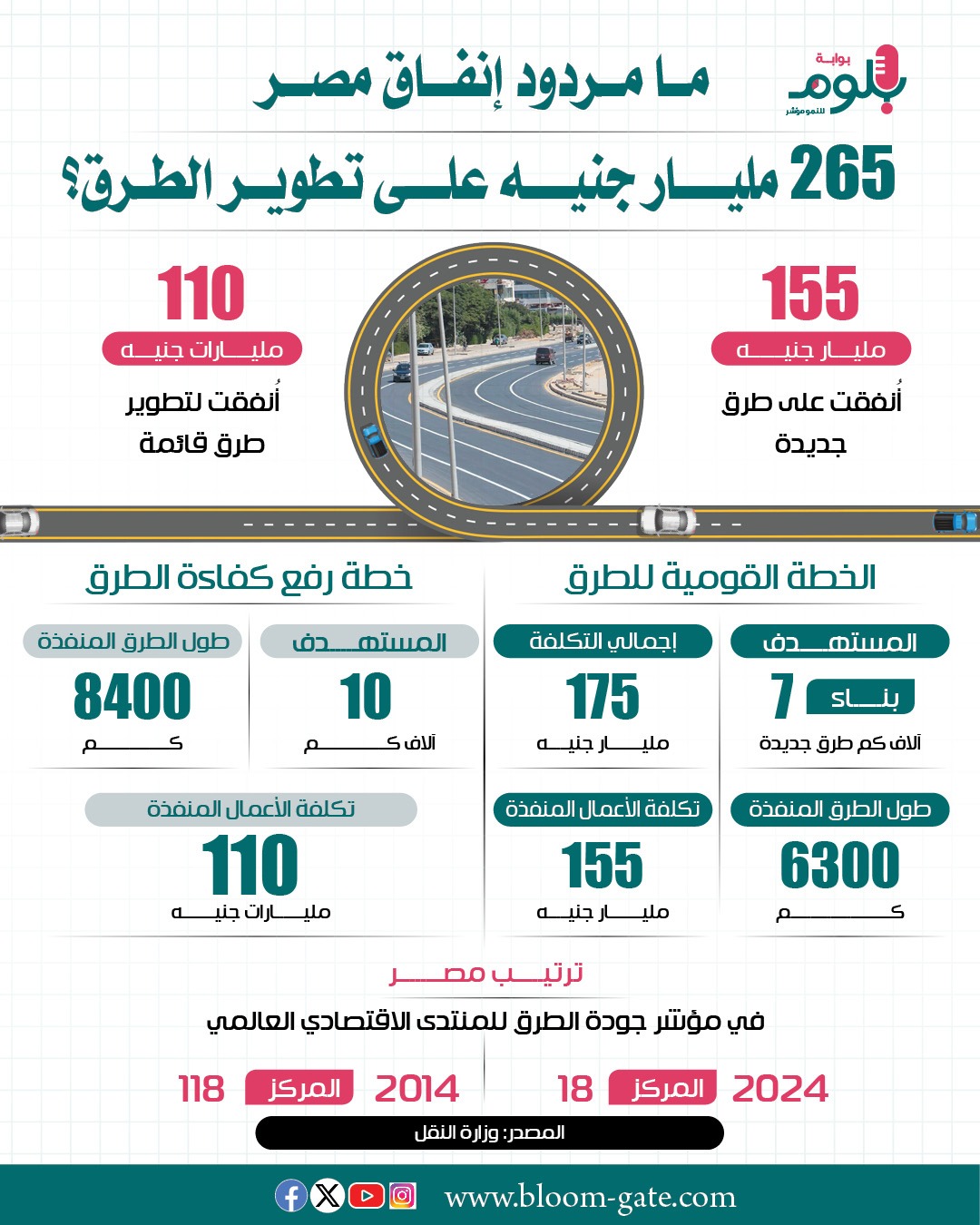 فيما وجهت الدولة استثمارات ضخمة في تطوير الطرق ضمن المشروع القومي للطرق باعتباره أحد محاور تطوير قطاع النقل الذي شغل حيزاً مهماً بخطة الدولة، شملت هذه الاستثمارات بناء طرق جديدة وزيادة الأطوال وتطوير الطرق القائمة، وهي الاستثمارات التي سنسلط عليها الضوء ونرصد تطور ترتيب مصر في مؤشر جودة الطرق عالمياً في الأنفوجراف التالي.