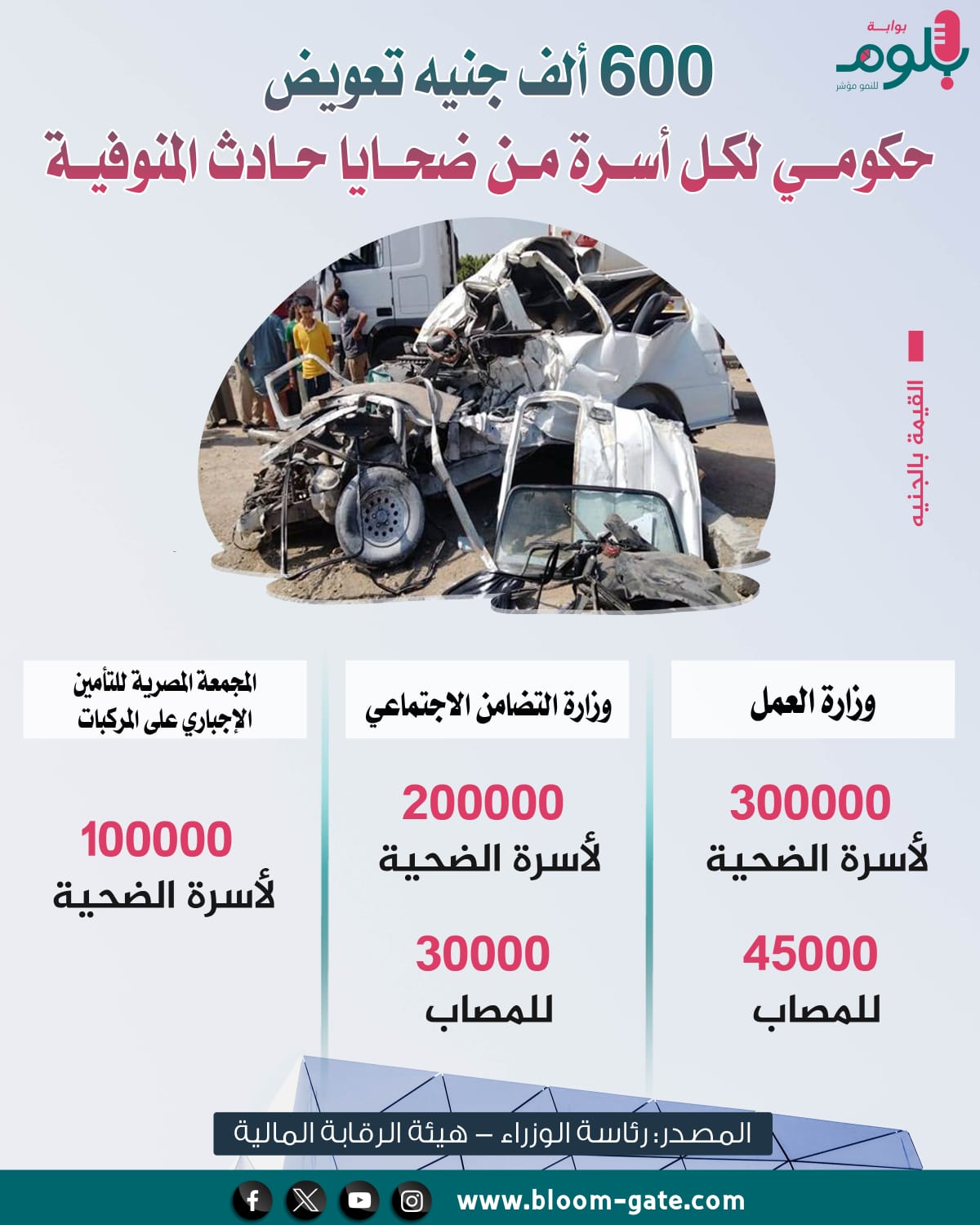 وسارعت الحكومة بالإعلان عن تقديم تعويضات مالية لأسر ضحايا حادث الطريق الإقليمي والمصابين، وأصدر الرئيس عبد الفتاح السيسي توجيهات بتقديم مبلغ 100 ألف جنيه لكل حالة وفاة، و25 ألف جنيه لكل حالة إصابة، إضافة إلى المبالغ التي قررتها كل من الوزارتين، وطالب لحكومة متابعة صيانة وإصلاح الطرق في مصر بكل دقة، وخاصة الطريق الدائري الإقليمي وسرعة الانتهاء منها، والتأكد من وجود الإرشادات المرورية في مناطق الإصلاح، ونستعرض في هذا التقرير حجم التعويضات التي أقرتها الحكومة لصالح ضحايا ومصابين حادث المنوفية.
