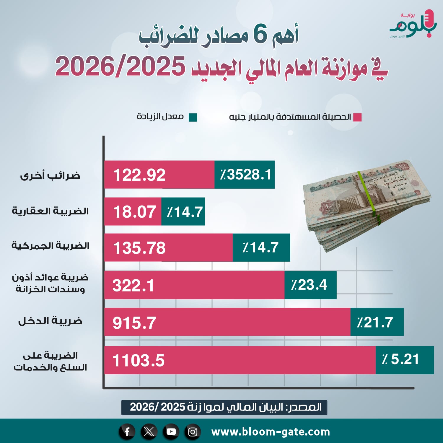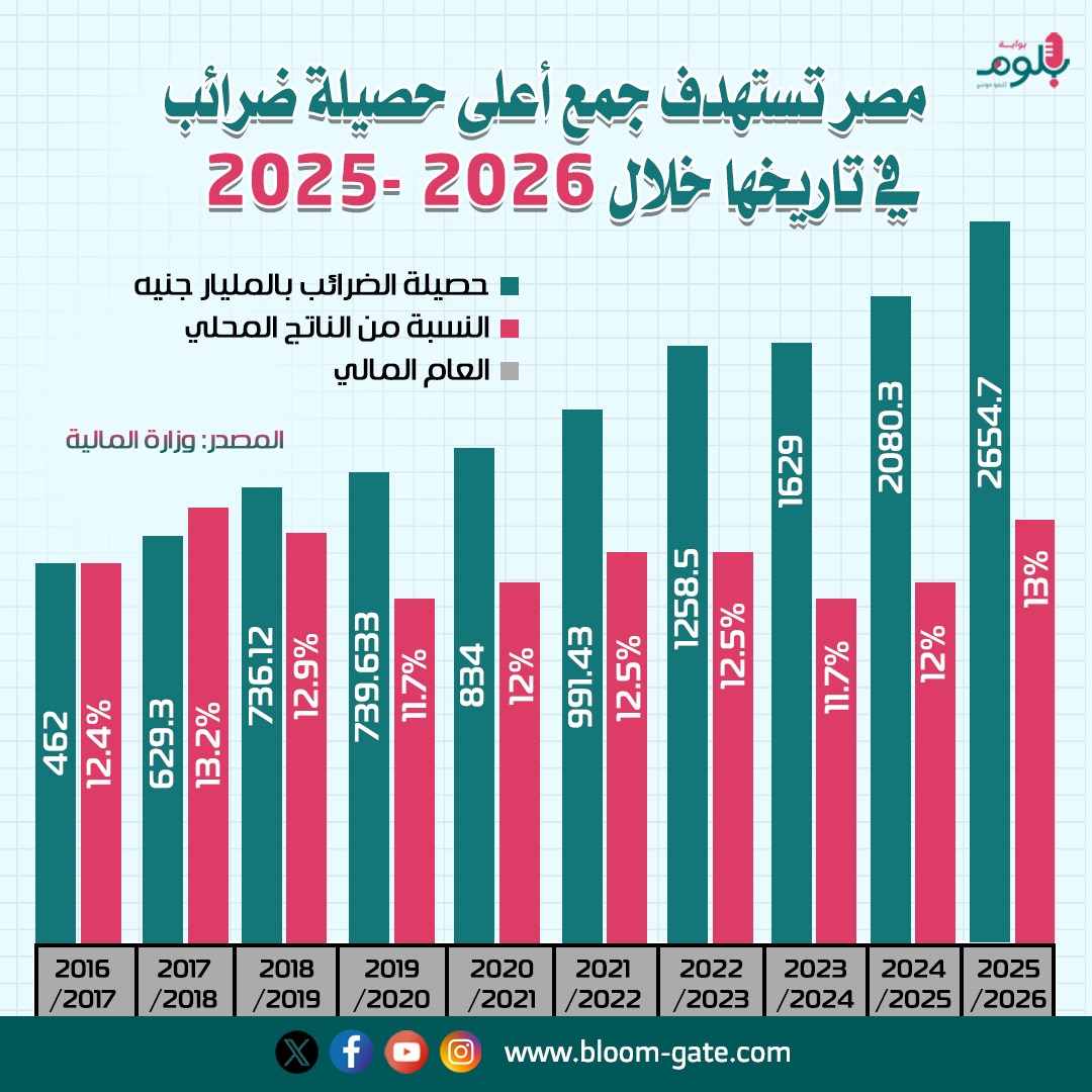 تستهدف مصر جمع أكبر حصيلة ضريبية في تاريخها خلال العام المالي المقبل 2025-2026 بقيمة تصل إلى 2.654 تريليون جنيه بما يعادل 13% من الناتج المحلي الإجمالي المستهدفة، وبزيادة تصل إلى 27.6% عن الحصيلة المُقدرة خلال العام المالي الجاري، وذلك بهدف سد العجز المتنامي في الموازنة والذي يقدر بنحو 1.49 تريليون جنيه، ونستعرض في هذا الإنفوجراف رحلة ضرائب المصريين في 10 سنوات.
