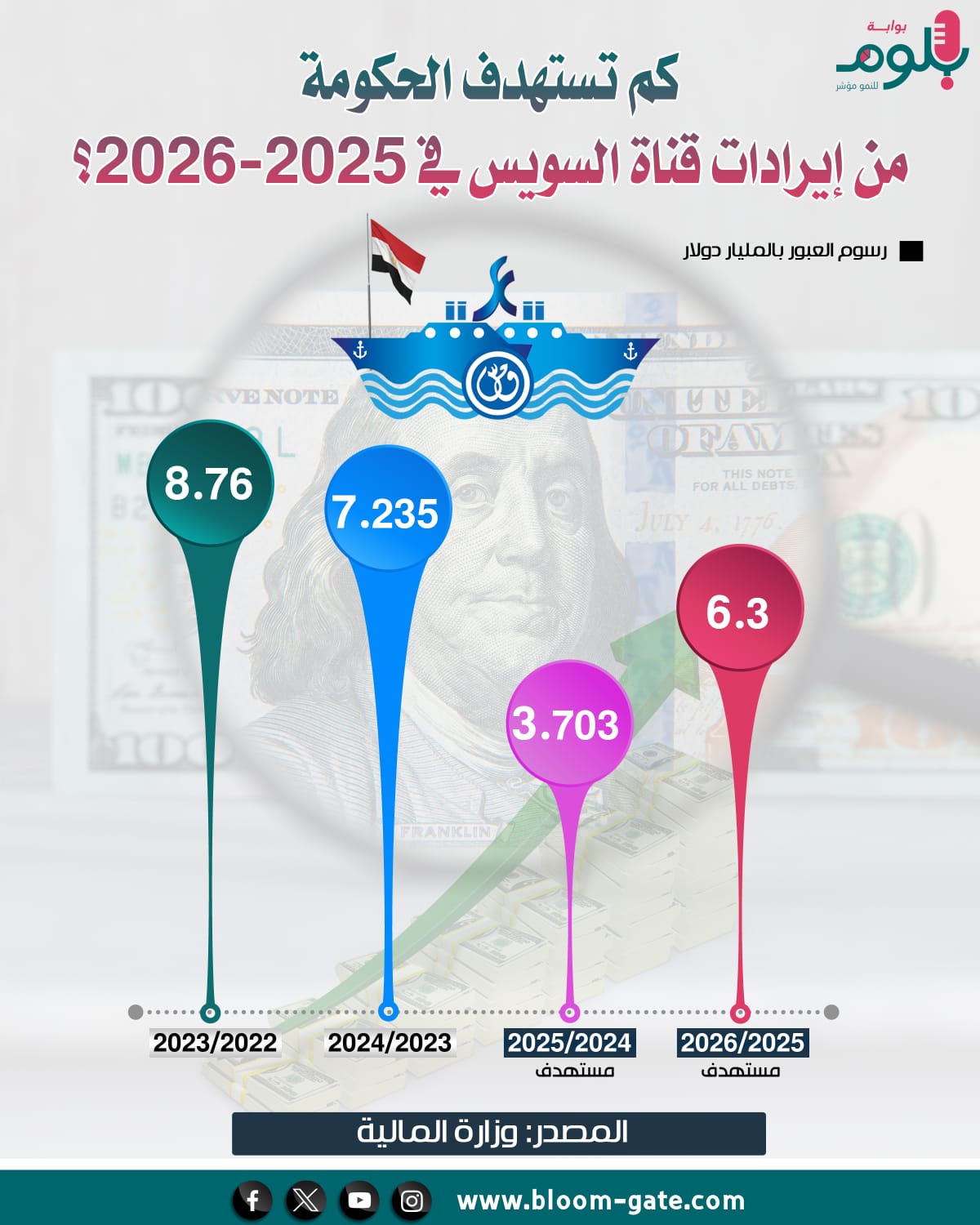 تتطلع الحكومة أن تشهد حركة العبور في قناة السويس تحسناً خلال العام المالي الجديد 2025-2026 حتى تقفز رسوم العبور بأكثر من 70% مقارنةً بتقديرات العام المالي الجاري، والتي تشهد تراجعاً في إيرادات القناة نتيجة الاضطرابات في البحر الأحمر بسبب الهجمات الحوثية على السفن ، وسنشير في الإنفوجراف الآتي إلى مستهدفات الحكومة من إيرادات قناة السويس.