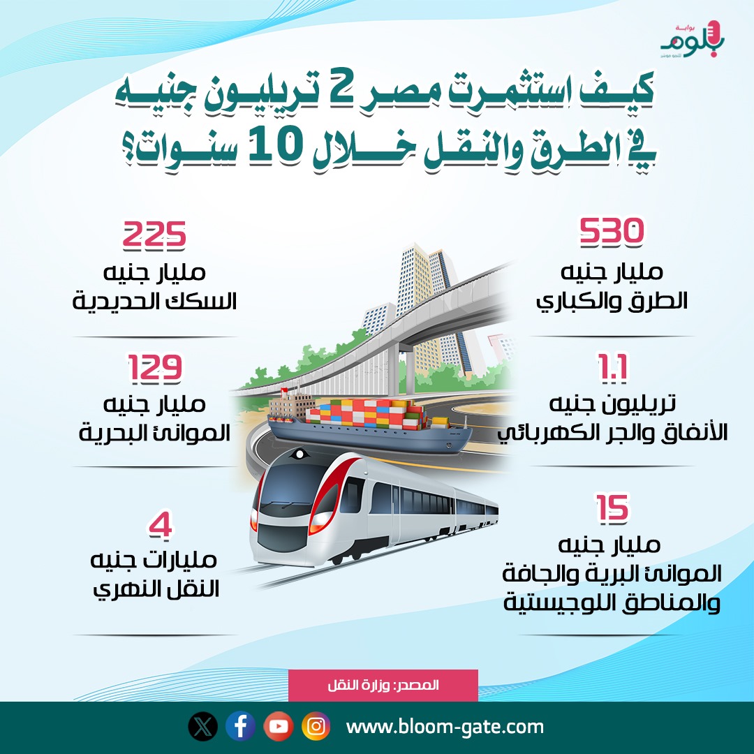 وتستكمل وزارة النقل حاليًا تنفيذ خطة شاملة لتطوير وتحديث عناصر منظومة النقل من وسائل وشبكات من الطرق والكباري، والسكك الحديدية، والأنفاق والجر الكهربائي، والموانىء والنقل النهري، باستثمارات ضخمة بلغت 2 تريليون جنيه خلال العقد الاخير، وهي الاستثمارات التي يسلط هذا الإنفوجراف الضوء عليها ومجالات إنتاجها.