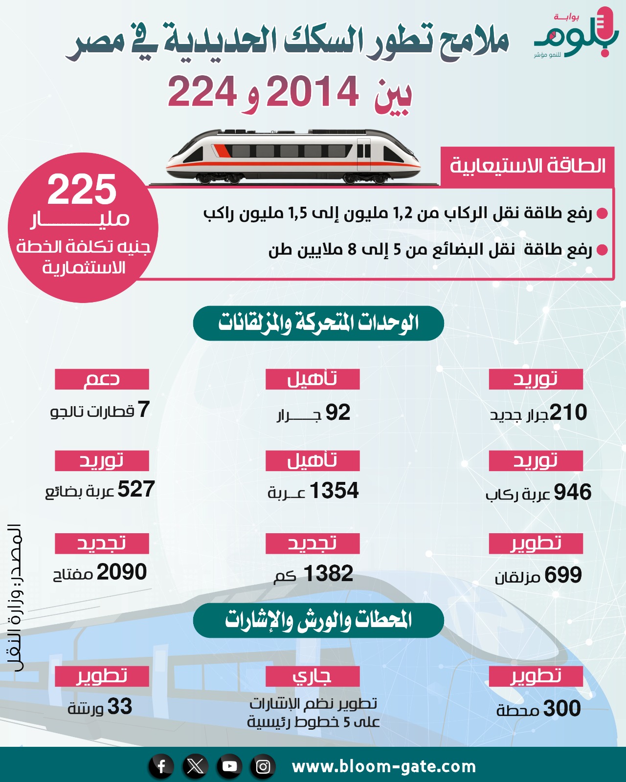 وخلال 10 سنوات نفذت وزارة النقل خطة لتطوير عناصر منظومة السكك الحديدية، ترتكز على عدة محاور رئيسية تشمل تطوير العربات والجرارات، والوحدات المتحركة، والبنية الأساسية، ونظم الإشارات والورش الإنتاجية وتنمية العنصر البشري، بهدف رفع طاقة النقل وتعظيم نقل الركاب والبضائع على خطوط الشبكة، وهو ما يستعرضه الإنفوجراف التالي.