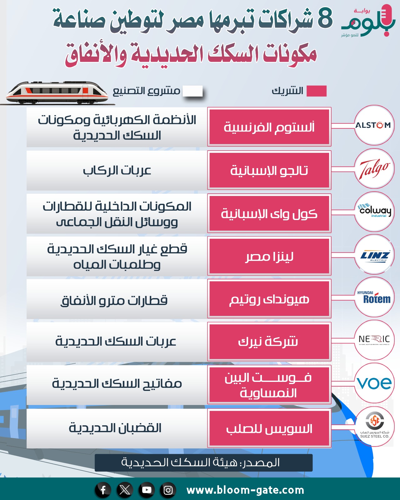 في الوقت نفسه، تمضي وزارة النقل في خطة توطين صناعات النقل، منها توطين صناعة القطارات والمترو وغيرها، وذلك من خلال اتفاقيات مع شركات عالمية، لنقل تكنولوجيا التصنيع فى مصر، والاستثمار فى مجال تصنيع وسائل النقل السككى، بهدف توفير النقد ونقل الخبرة للعمالة المصرية وتصدير الفائض للدول الافريقية والعربية، ويتناول الإنفوجراف الآتي الاتفاقيات التي أبرمتها وزارة النقل لتوطين الصناعات المرتبطة بها.