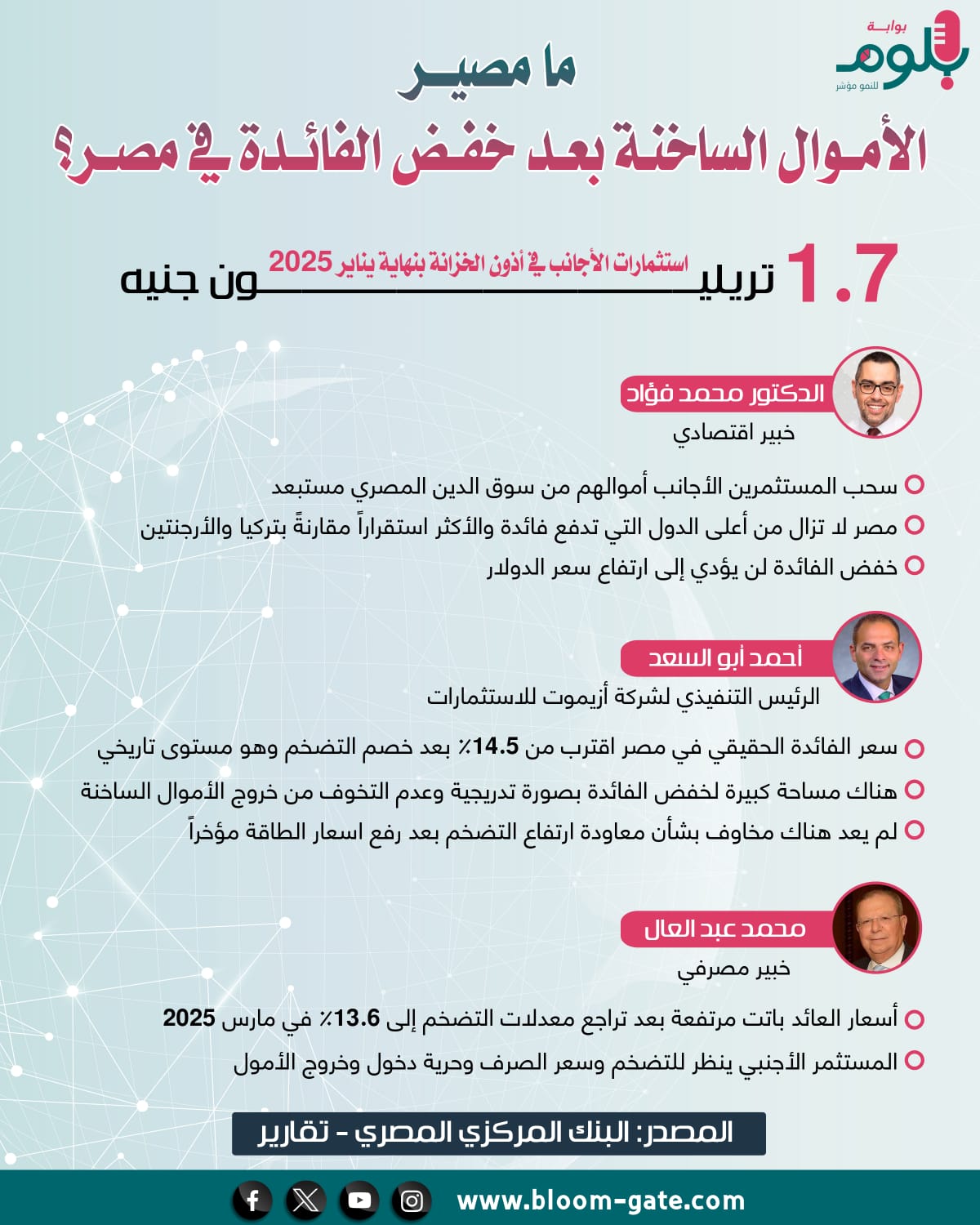 على الجانب الآخر، تخوف البعض من أن ينعكس خفض الفائدة سلباً على قدرة مصر على جذب استثمارات الأجانب إلى إصدارات الدين الحكومية من أذون وسندات الخزانة، بل نزوح الأموال الساخنة الحالية خاصةً مع زيادة تركيا أسعار الفائدة مؤخراً بمقدار 3%، ويرصد الإنفوجراف التالي توقعات تأثير القرار على الأموال الساخنة في مصر.