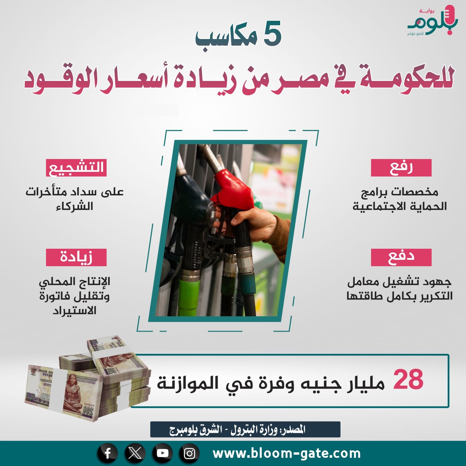 تجني الحكومة ثمار تحرير سعر المواد البترولية باستثناء السولار في صورة خفض مخصصات دعم الوقود الذي يشكل واحداً من بنود الدعم المهم، ومن ثم الحد من أعباء الموازنة العامة للدولة، وإتاحة مساحة أكبر للتصرف وتوجيه الموارد المالية، ونسلط الضوء على هذه المكاسب الحكومية في الإنفوجراف الآتي.