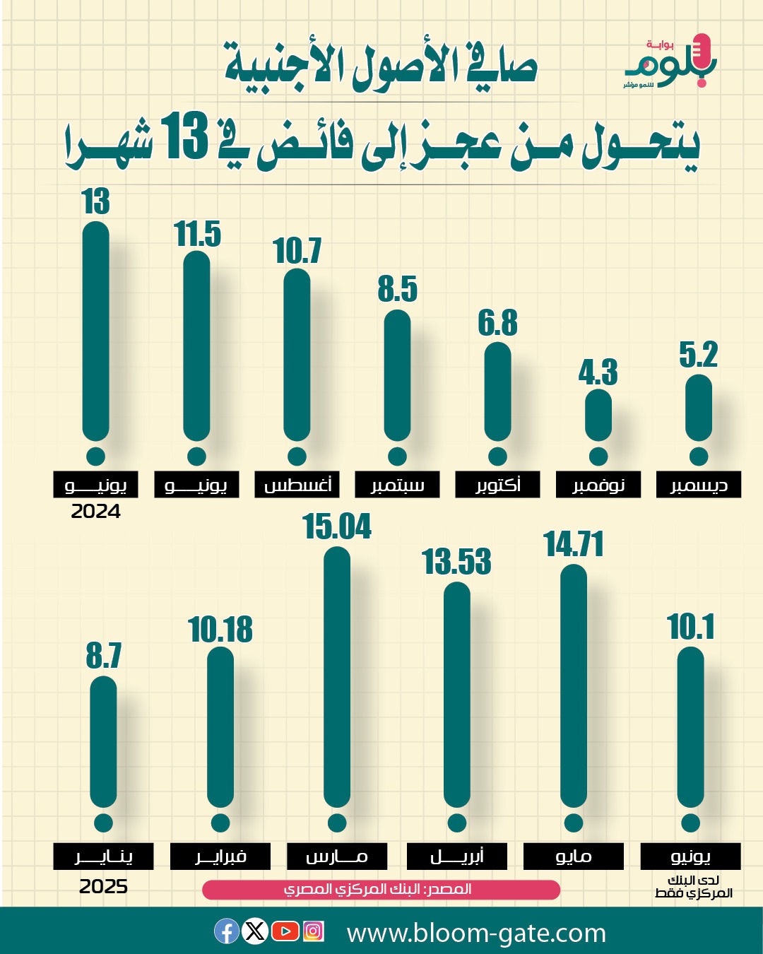 على الرغم من العجز المسجل في ميزان المدفوعات خلال الفترة من يوليو 2024 حتى مارس 2025، فإن صافي الأصول الأجنبية خلال الثلاثة أشهر التالي حتى يونيو 2025 سجلت تحسناً، ما يشكل دعماً لسعر الصرف، ونستعرض في هذا الإنفوجراف تطور صافي الأصول الأجنبية للقطاع المصرفي خلال آخر 12 شهر.