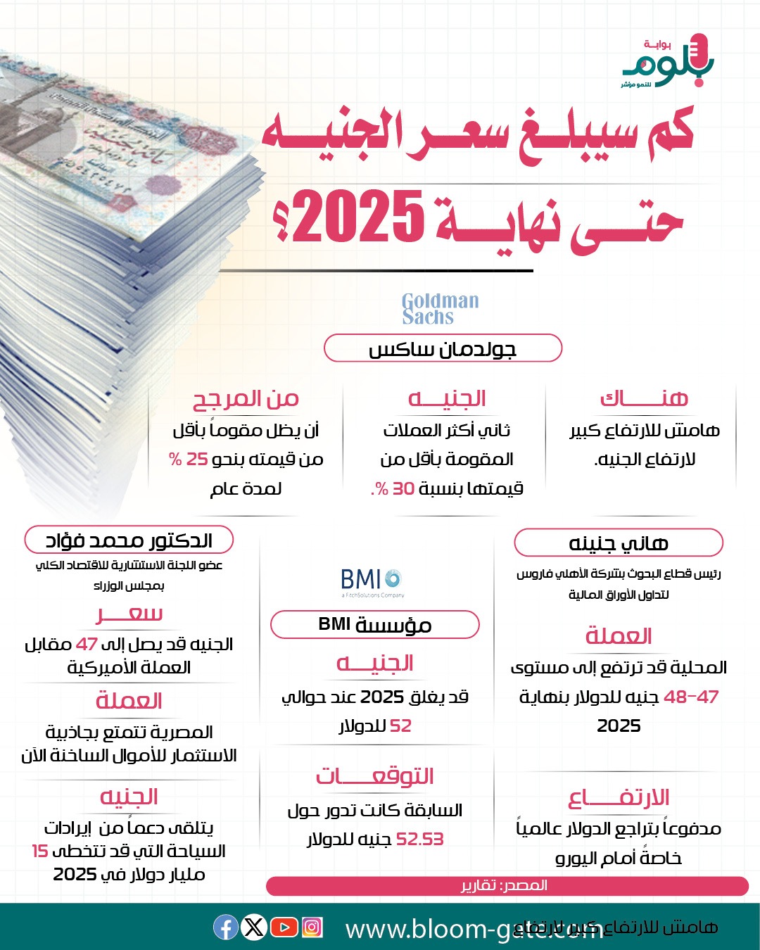 من جانب آخر، تتباين توقعات المؤسسات المالية المحلية والدولية بشأن مصير سعر صرف الجنيه حتى نهاية عام 2025، استناداً إلى تدفقات النقد الأجنبي للبلاد والسياسات النقدية التي ينتهجها البنك المركزي المصري في إدارة ملف أسعار الفائدة، والذي يرتبط بشكل وثيق بتدفق الأموال الساخنة إلى إصدارات الدين الحكومية، ويسلط الإنفوجراف الآتي الضوء على توقعات سعر الجنيه.