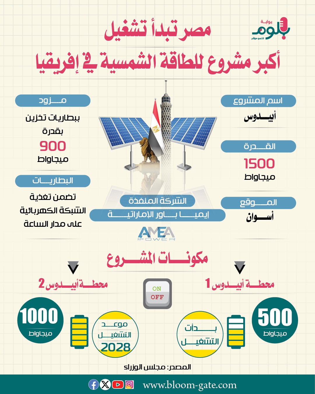 شهد الأسبوع الماضي بدء تشغيل المحطة الأولى ضمن المشروع الأكبر من نوعه في القارة الأفريقية لتوليد الطاقة الشمسية بإجمالي قدرات تصل إلى 1500 ميجاواط بمجمع بنبان في محافظة أسوان، وتم ربط المشروع بالشبكة القومية للكهرباء للمساهمة في تلبية الطلب المتزايد خلال فصل الصيف، وتحقيق هدف الوصول بنسبة مساهمة الطاقة المتجددة في مزيج الطاقة الكهربائية إلى 42% بحلول 2030، ونتناول في الإنفوجراف التالي تفاصيل مشروع أبيدوس، والذي سيكون له دور في منع انقطاع الكهرباء في مصر خلال السنوات المقبلة.