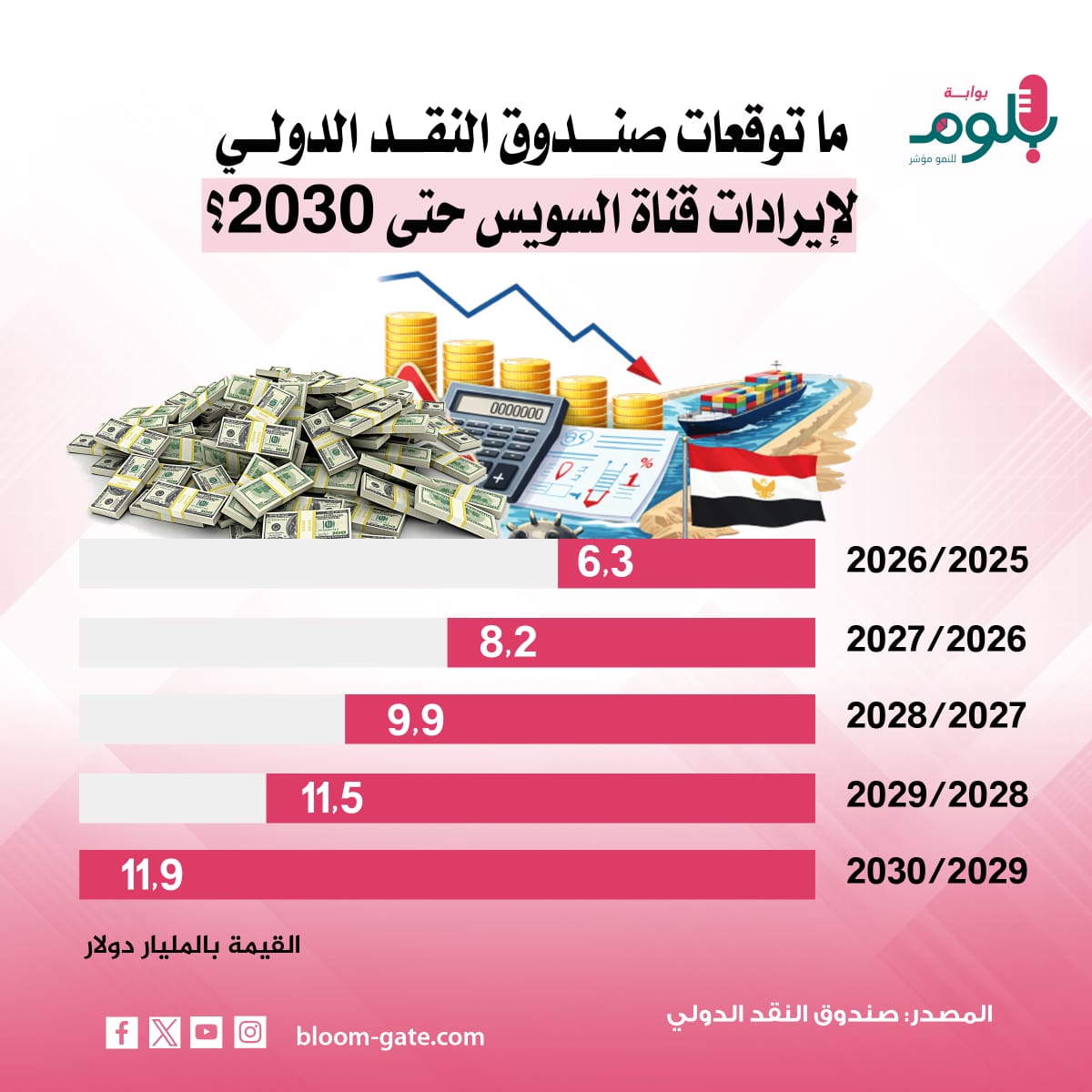 فيما رسم صندوق النقد الدولي توقعات لعائدات القناة خلال السنوات المالية الأربعة القادمة حتى 2029/2029، استنادًا إلى فرص القناة في استعادة الزخم وإعادة توجيه خطوط الشحن لمزيد من خدماتها الملاحية للقناة، بالتوازي مع نمو حركة التجارة العالمية، لاسيما أن قناة السويس تستحوذ على 12% من البضائع المنقولة بحرًا عالميًا، ونرصد في الإنفوجراف القادم توقعات صندوق النقد لعائدات القناة.