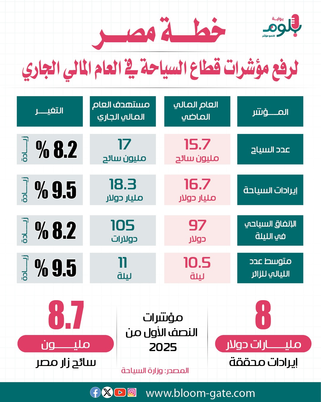 نبدأ من ملف السياحة، والذي حددت مصر فيه أهدافا محددا، تتعلق بزيادة الإيرادات، وعدد السائحين، إذ تخطط مصر لجذب نحو 30 مليون سائح سنويا بحلول عام 2030، مع الوصول بالإيرادات السياحية لأكثر من 24 مليار دولار بنهاية العام المالي 2028-2029، وذلك لتأمين إيرادات مصر الدولارية، وتنمية ذلك القطاع الواعد، والذي أثبت قوته على الرغم من التوترات التي ضربت منطقة الشرق الأوسط، ورغم ذلك فإنها حققت مؤشرات قوية خلال النصف الأول من العام الجاري، وفي الإنفوجراف الآتي سوف نسلط الضوء على خطة العام المالي 2025/2026 مقارنة بما تحقق في العام المالي المنقضي.