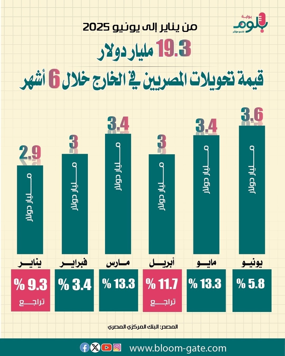 تصدرت تحويلات المصريين في الخارج كان لها الدور الأكبر في تعزيز إيرادات مصر الدولارية في الأشهر الماضية، إذ أنها رغم ما شهدته من تباين نسبي تأثراً بالأحوال الاقتصادية التي مرت بها مصر وتقلبات سعر الصرف ومدى استقراره، إلا أنها مع بدء تحركات البنك المركزي المصري لضبط ملف سعر الصرف كان الانتعاش هو النتيجة التي عادت على التحويلات، وفي الإنفوجراف الآتي سوف نسلط الضوء على وضع تحويلات المغتربين منذ بداية العام الجاري حتى شهر يونيو، والتغير الشهري الذي طرأ عليها.