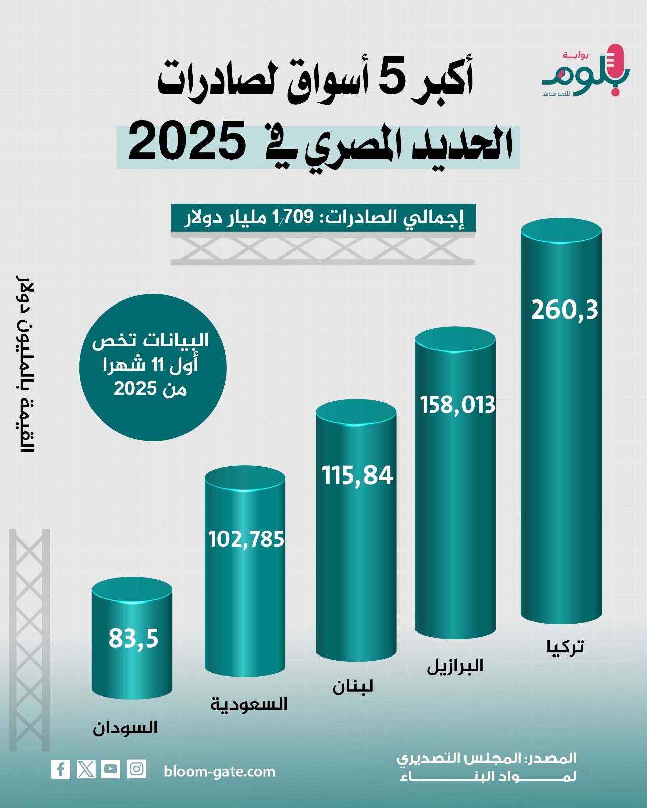 سجلت صادرات مصر من الحديد والصلب نحو 1.709 مليار دولار خلال الفترة من يناير إلى نوفمبر 2025، متجهة إلى 87 دولة، متراجعة بنسبة 18% مقارنة بنفس الفترة من عام 2024 التي سجلت 2.085 مليار دولار، وفقاً لتقرير المجلس التصديري لمواد البناء، ونرصد في الإنفوجراف التالي أبرز وجهات صادرات الحديد المصري.