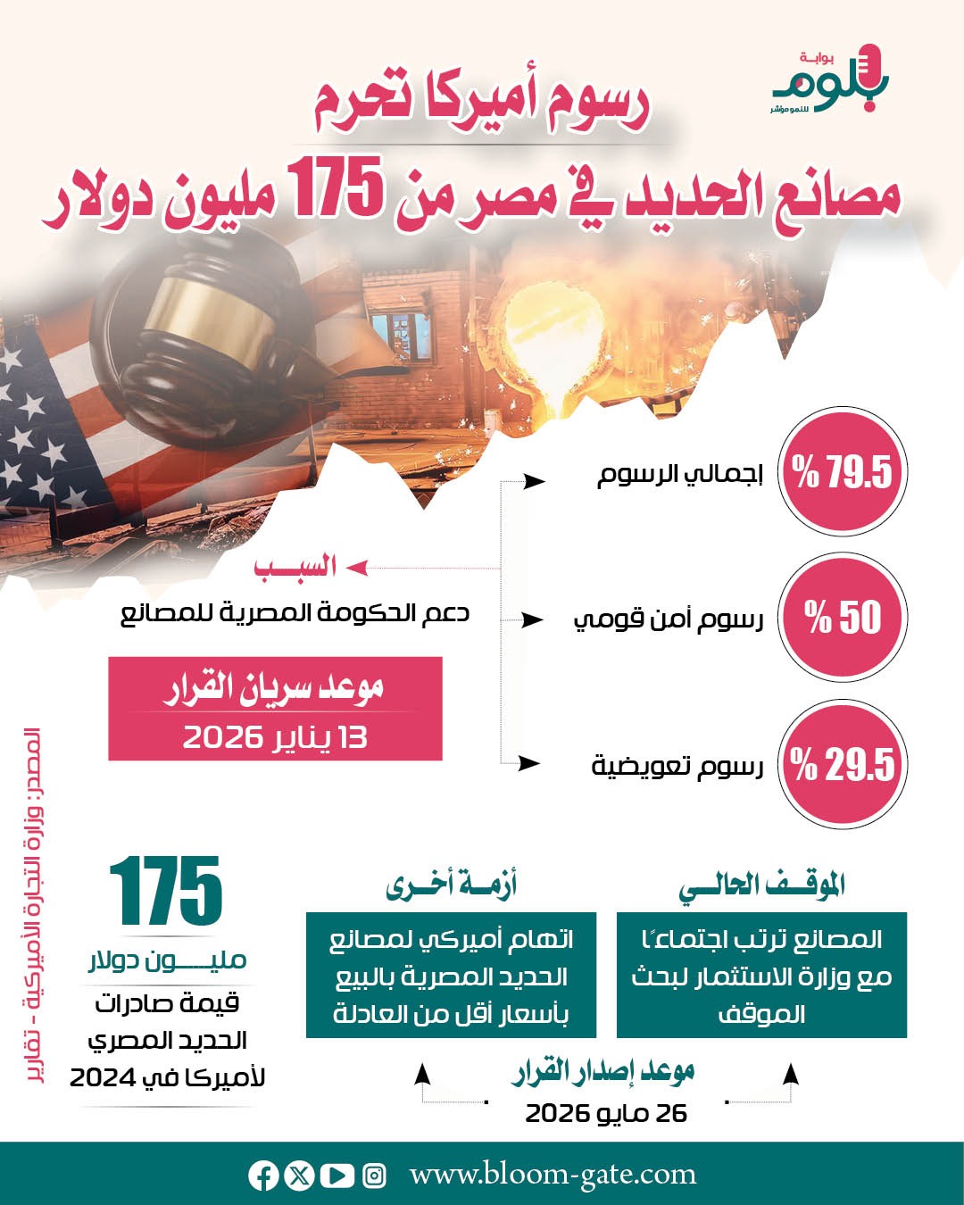 يبحث مصنعي الحديد في مصر عقد لقاء مع ممثلي وزارة الاستثمار والتجارة الخارجية لبحث تداعيات القرار الأمريكي الأخير بشأن فرض رسوم على الحديد المصري بنسبة 29.51%، ويأتي هذا الاجتماع في ظل حالة من عدم الوضوح لدى القطاع حول تفاصيل القرار وآليات تطبيقه، وهو ما يؤكد الحاجة الملحة لتنسيق سريع بين الحكومة والقطاع الخاص لاحتواء الأزمة، ونستعرض في الأنفوجراف التالي تفاصيل الأزمة وحجم صادرات مصر من الحديد للسوق الأميركية.
